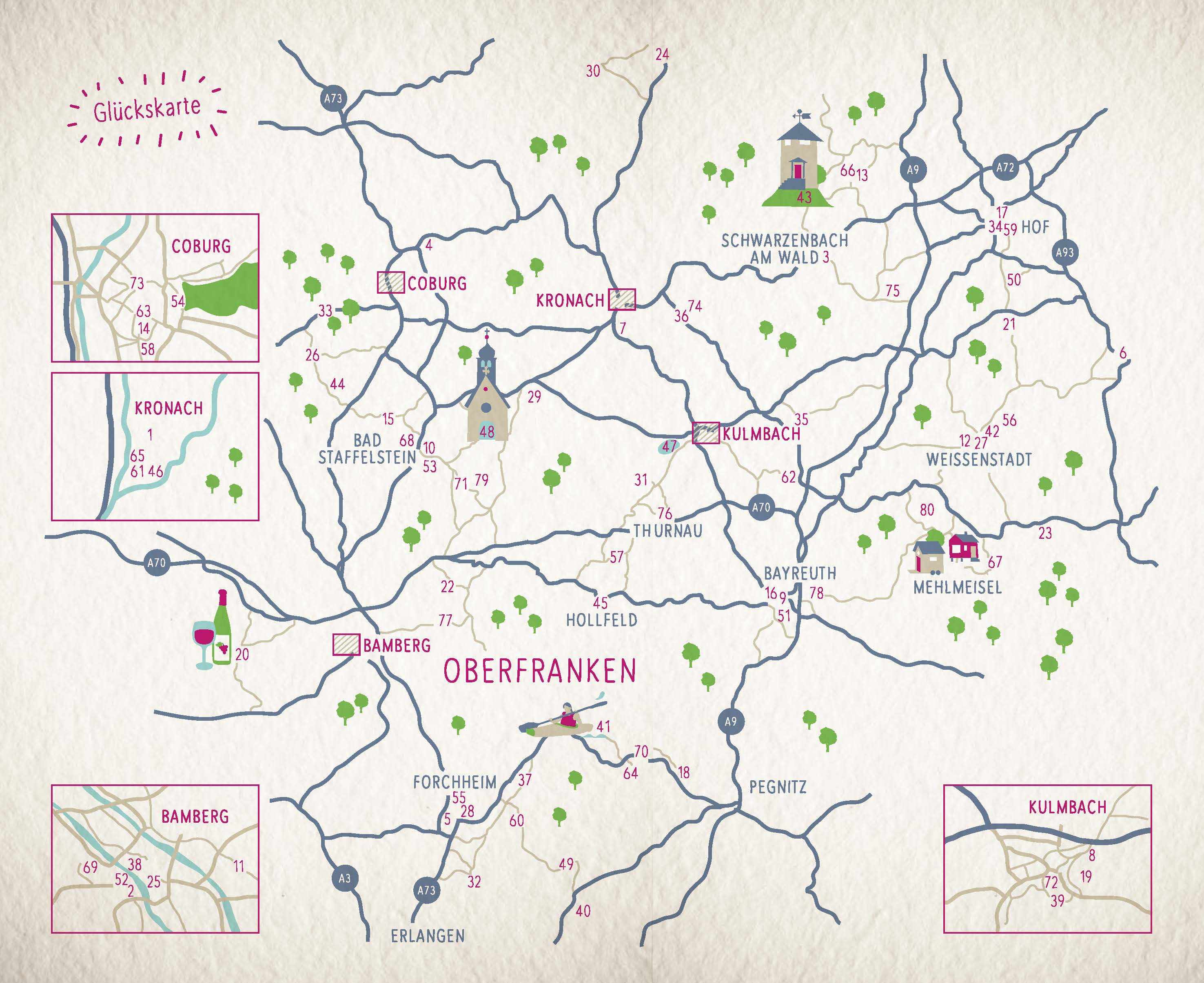 Ein Potpourri voller Glücksorte, das ist Oberfranken. Hier finden sich entzückende Cafés, liebenswerte Läden, mächtige Burgen und spannende Museen, umrahmt von einer mehr als eindrucksvollen Natur. Wer immer schon einmal wissen wollte, was Oberfranken und Entenhausen gemeinsam haben und wo fränkische Brautraditionen zur ganz großen Liebe wird, ist hier im Norden Bayerns genau richtig. Spätestens, wenn man dann mit einer Gondel durch Klein-Venedig schippert, unter Tanzlinden an die gute alte Zeit erinnert wird oder beim Wandern durch den Frankenwald Natur pur und grandiose Ausblicke genießt, ist klar: Eine Reise nach Oberfranken ist eine Reise zum Glück!