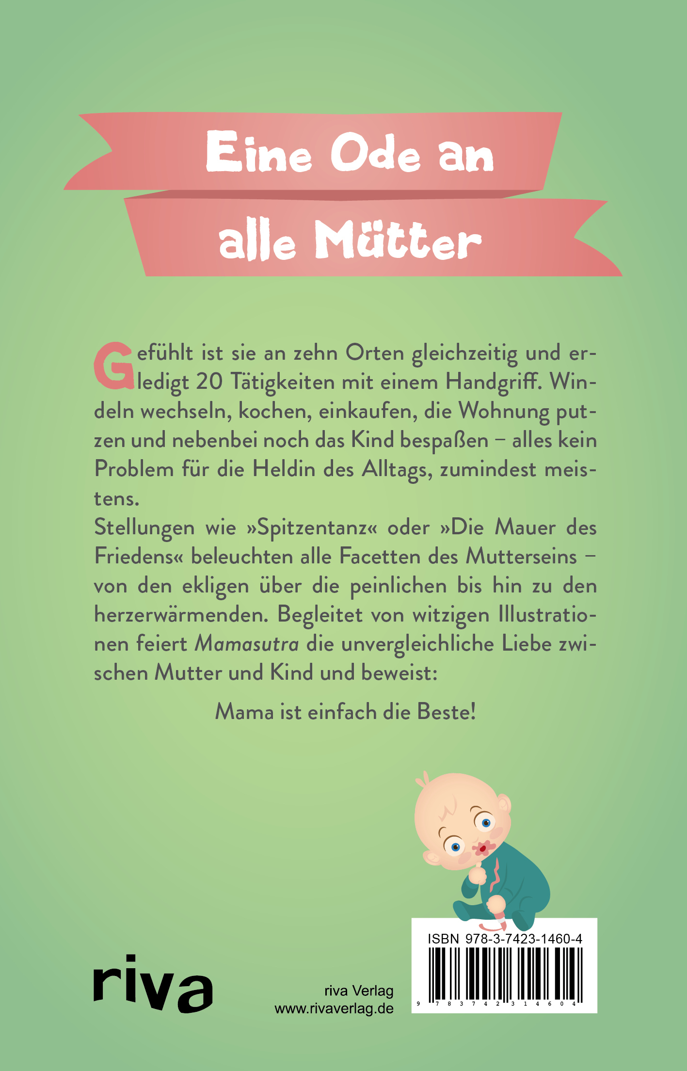 Eine Ode an alle MütterGefühlt ist sie an zehn Orten gleichzeitig und erledigt 20 Tätigkeiten mit einem Handgriff. Windeln wechseln, kochen, einkaufen, die Wohnung putzen und nebenbei noch das Kind bespaßen - alles kein Problem für die Heldin des Alltags, zumindest meistens.Stellungen wie »Spitzentanz« oder »Die Mauer des Friedens« beleuchten alle Facetten des Mutterseins - von den ekligen über die peinlichen bis hin zu den herzerwärmenden. Begleitet von witzigen Illustrationen feiert »Mamasutra« die unvergleichliche Liebe zwischen Mutter und Kind und beweist: Mama ist einfach die Beste!