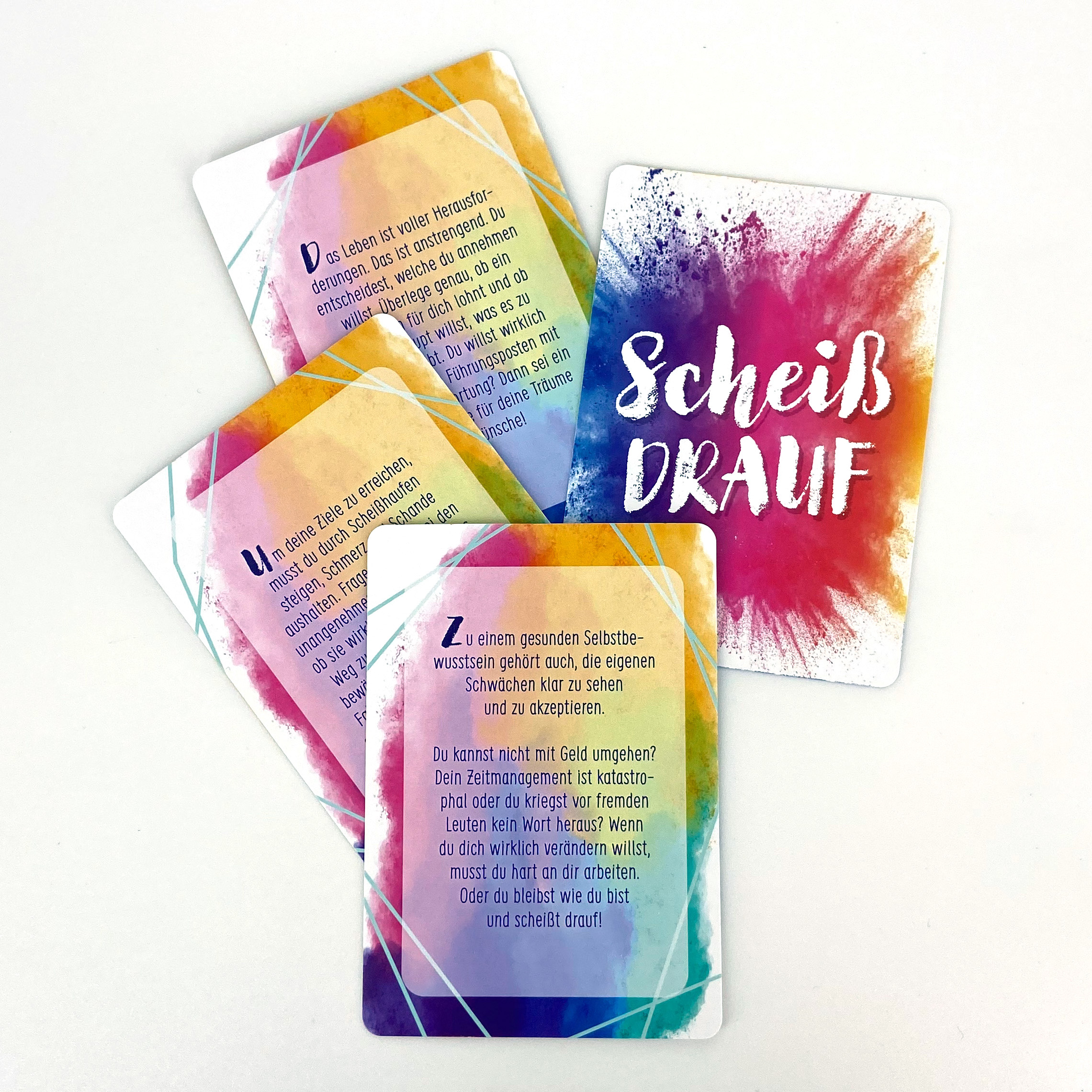 Auf Instagram tummeln sich perfekte Leben? Bei allen läuft es so richtig super, nur du selbst bleibst auf der Strecke? Der Kollege heimst das Lob ein, das du selbst verdient hättest?Scheiß drauf!Das Leben ist nicht perfekt, und das ist auch gut so!Diese Impulskarten erinnern dich daran, was wirklich wichtig ist: Zieh dein eigenes Ding durch und scheiße gepflegt auf das, was dich davon abhält, dein eigenes Leben zu genießen. Mach dich frei und verwende deine Energie für das, was dich stark macht!