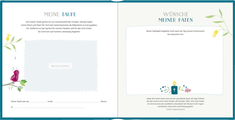 Klein aber fein bietet dieses perlmuttschimmernde Album genug Platz für Erinnerungen und ausgewählte Fotos vom großen Fest. Die zauberhaften Illustrationen und die kurzen Texte und Gebete betten die Erinnerungen in einen kindgerechten, ansprechenden Rahmen. Eine edle Note bekommt es durch das verspielte Covermotiv mit Folienveredelung.