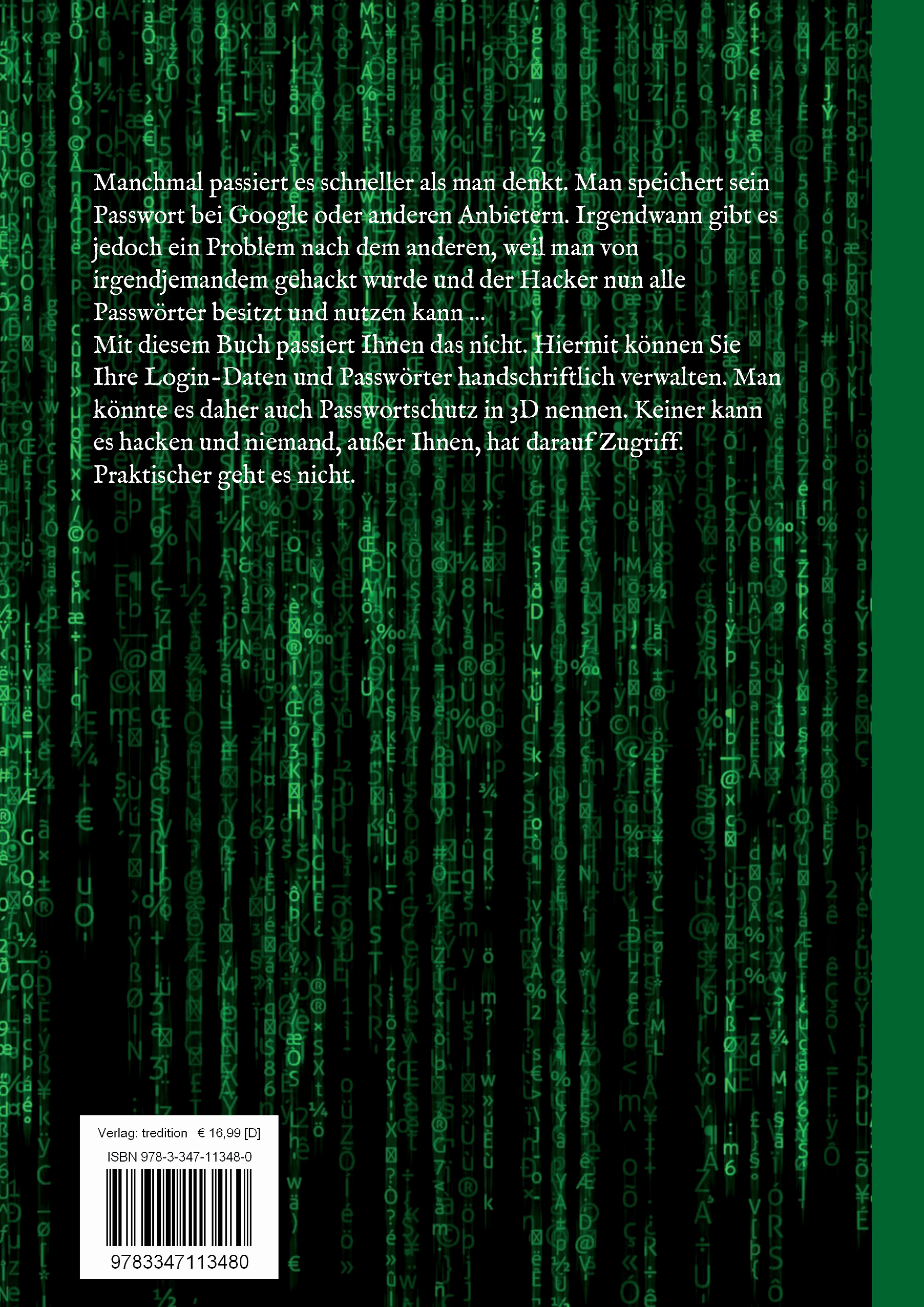 Manchmal passiert es schneller als man denkt. Man speichert sein Passwort bei Google oder anderen Anbietern. Irgendwann gibt es jedoch ein Problem nach dem anderen, weil man von irgendjemandem gehackt wurde und der Hacker nun alle Passwörter besitzt und nutzen kann ... Mit diesem Buch passiert Ihnen das nicht. Hiermit können Sie Ihre Login-Daten und Passwörter handschriftlich verwalten. Man könnte es daher auch Passwortschutz in 3D nennen. Keiner kann es hacken und niemand, außer Ihnen, hat darauf Zugriff. Praktischer geht es nicht.