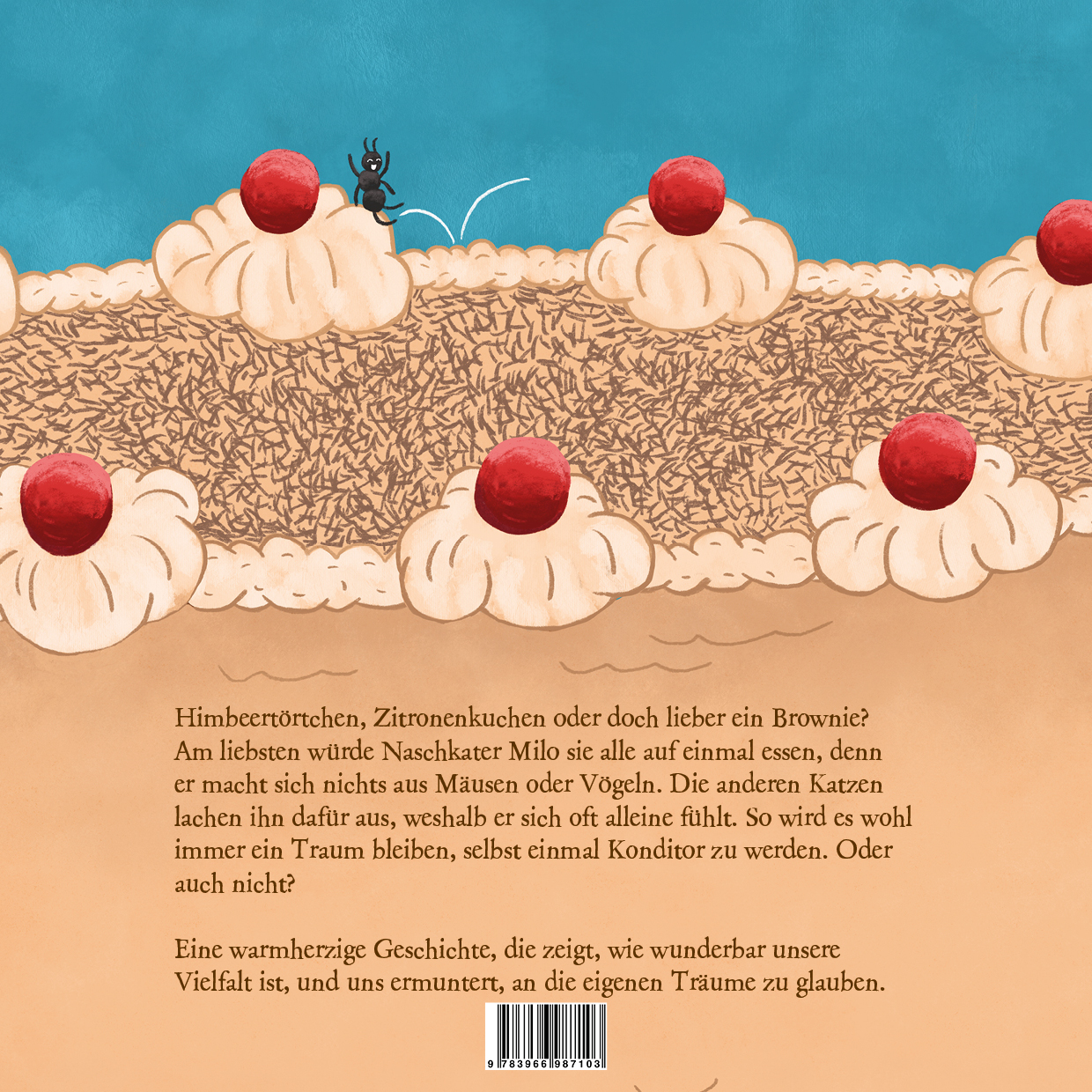 Kater Milo ist nicht wie andere Kater. Zwar geht auch er auf nächtliche Jagd, doch sein Ziel sind die Kuchenreste seines Lieblingscafés. Milo ist nämlich Vegetarier, die Vorstellung Mäuse zu essen findet er gruselig. Hätte man dann nicht auch ganz viele Haare zwischen den Zähnen? Alleine bei dem Gedanken sträubt sich sein Fell. Lieber an ein leckeres Himbeertörtchen denken, oder einen fluffigen Zitronen-Baiser oder doch lieber eine Schokotorte? Egal, alles lecker.Sein größter Traum ist es, selbst einmal ein Konditor zu werden und sein eigenes Café zu eröffnen. Die Realität sieht leider gar nicht so aus. Die anderen Katzen machen sich stets über ihn lustig und behaupten, dass er gar kein richtiger Kater sei. Deshalb geht Milo ihnen aus dem Weg und ist ziemlich einsam. Bis er eines Tages auf seinem Beutezug eine verwundete Maus trifft. Natürlich lässt er sie nicht einfach da liegen, sondern nimmt sie mit und päppelt sie auf. Eine ungewöhnliche Freundschaft entsteht und zusammen realisieren sie endlich Milos Traum.Ziel des Buches ist es, Kinder dabei zu unterstützen, sich selbst und andere so zu akzeptieren, wie sie sind. Außerdem ist es ein Aufruf, an die eigenen Träume zu glauben. Bietet Eltern eine gute Grundlage, um mit ihrem Nachwuchs über Themen wie Vielfalt und Ausgrenzung zu reden. Dabei geschieht das ganz ohne mahnenden Zeigefinger - die Kinder nehmen die Botschaft durch Milos Geschichte auf.Dieses gereimte Bilderbuch ist nachhaltig in Deutschland produziert. Es wurden Dabei bezieht sich das auf den gesamten Herstellungsprozess:- Verwendung von Recyclingpapier zertifiziert mit dem Blauen Engel- cobaltfreie, vegane Druckfarben auf Basis von- nachwachsenden Pflanzenölen - Verzicht auf tierische Inhaltsstoffe- Ressourcenschonende und klimafreundliche Produktion- Konsequentes Recycling- Abfallminimierung- Druckerei erzeugt selbst erneuerbare Energie
