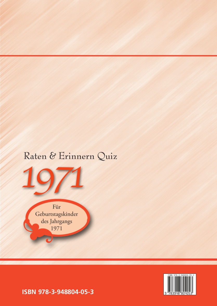 Nicht nur wer 1971 geboren wurde, wird viel Spaß und Freude mit diesem Quizband haben. Die Fragen und Antworten regen zum Nachdenken und Erinnern an. Eine Zeitreise für das Gedächtnis.