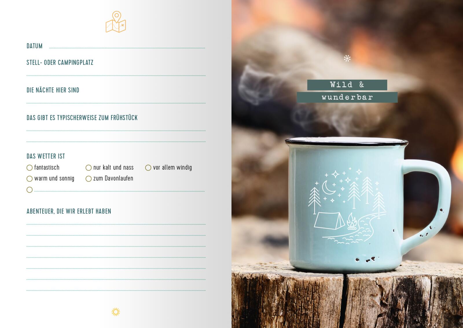 - Schöner und praktischer Reisebegleiter: Modern gestaltetes Eintragbuch mit Platz für Packlisten, Reiseerinnerungen, Infos zu Stellplätzen und Geheimtipps
