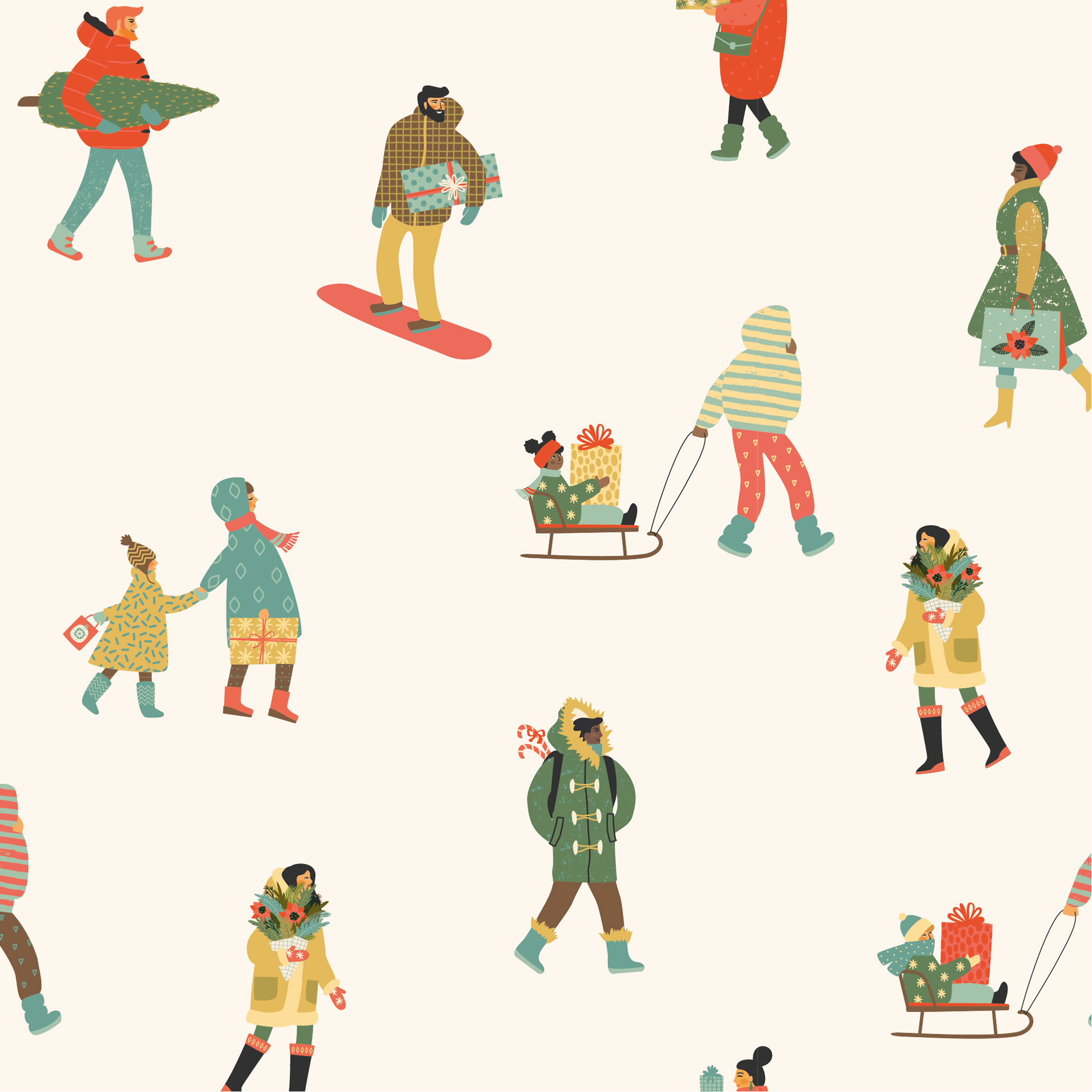 Dieses umweltfreundliche Geschenkpapier für Kinder und Erwachsene zeigt als Motiv Menschen im Wintertrubel, die z.B. Schlittenfahren und Snowboarden oder Weihnachtsbäume und Geschenke einkaufen. Dabei wurde im Design auf die Diversität der Personen Wert gelegt, so dass auch People of Color bzw. Schwarze Menschen zu sehen sind. Geliefert wird ein Set aus vier Bögen (je DIN A2 = ca. 42 x 59 cm, gefaltet auf A4) mit vier passenden Geschenkanhängern mit "Merry Christmas" Handlettering-Schriftzug.