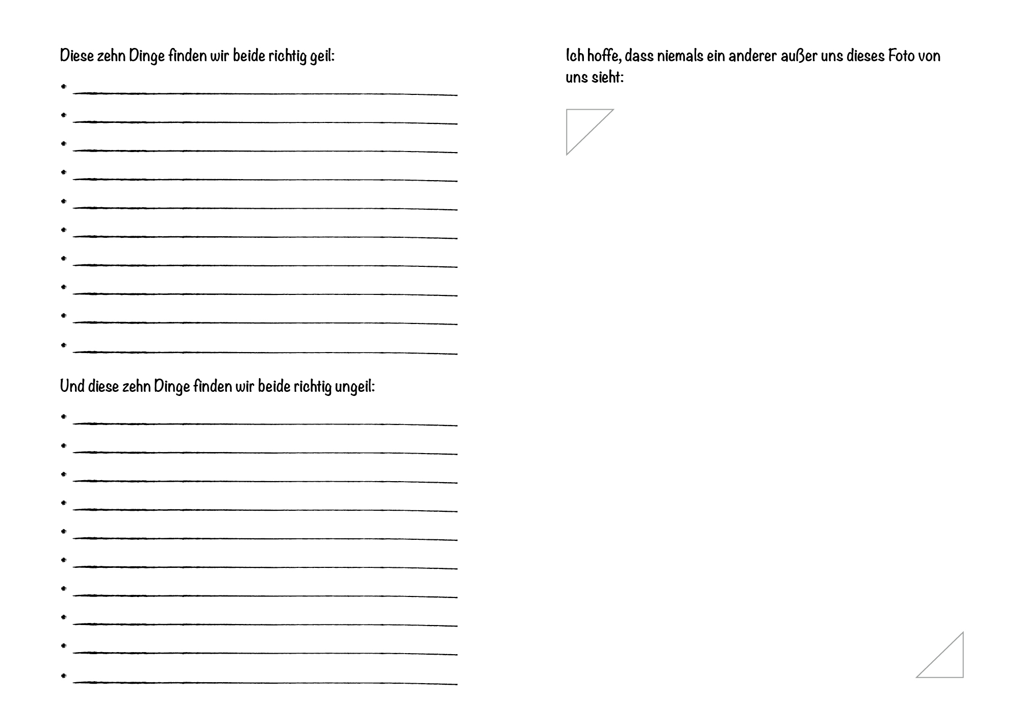 Dies ist kein gewöhnliches Ausfüllbuch. Es ist der Beweis einer einzigartigen Freundschaft zu einem wunderbaren Menschen.Egal ob Mann oder Frau, jeder kann dieses Buch ausfüllen und seiner besten Freundin oder seinem Freund schenken, um ihm auf persönlichste Weise zu beweisen, wie gern man ihn hat.Auf den abwechslungsreich gestalteten Seiten finden sich interessante, lustige, fantasievolle und freche Fragen zum Ankreuzen oder Ausfüllen, die an die schönen und besonderen Momente zu zweit erinnern: zusammen verbrachte Zeit, gemeinsame Ausflüge und Reisen, abgefahrene Nächte, verkaterte Sonntage, geteilte Leidenschaften, geteiltes Leid, Höhen und Tiefen, Glück und Krisen. All das kannst du nun mit diesem Buch für die Ewigkeit festhalten und deinem Best Buddy als Geschenk überreichen. Das Buch bietet zudem reichlich Platz für Fotos und Zeichnungen, bei denen du dich kreativ verausgaben kannst.Setze eurer Freundschaft ein Denkmal und überrasche deine Freundin oder deinen Freund mit diesem einzigartigen Buch.