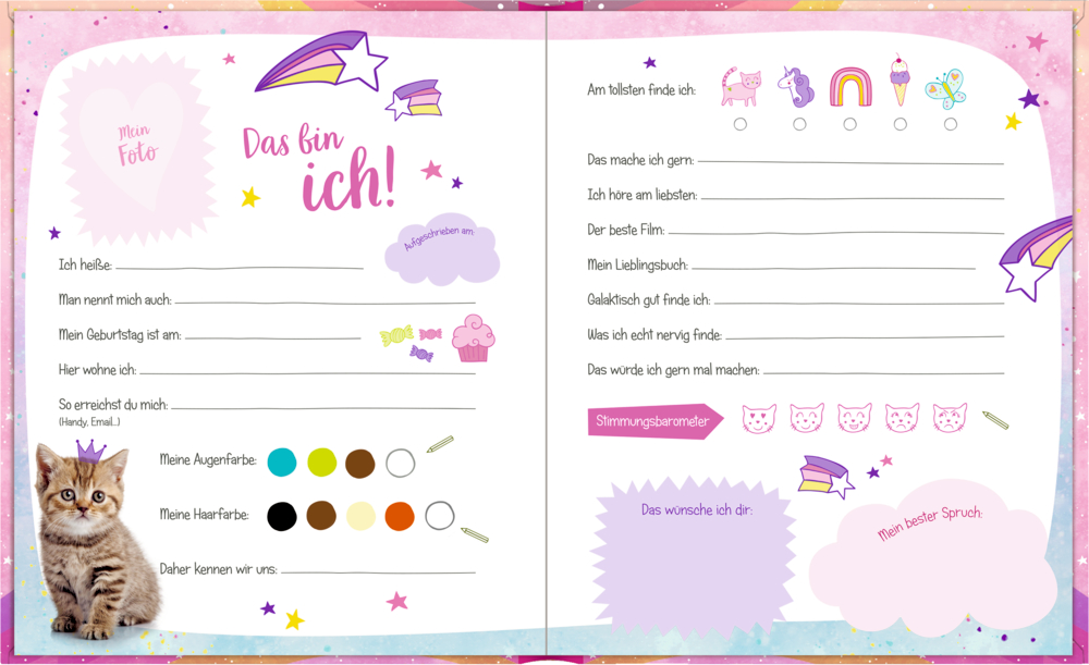 Dieses fantasievoll gestaltete Freundebuch bietet auf 96 Seiten genug Platz zum Eintragen für alle Freundinnen und Freunde. Das schimmernde Cover und die zuckersüßen Katzenmotive im Innenteil machen dieses Freundebuch zum besonderen Eintrag-Spaß. Als Extra gibt es einen Geburtstagskalender zum Eintragen.