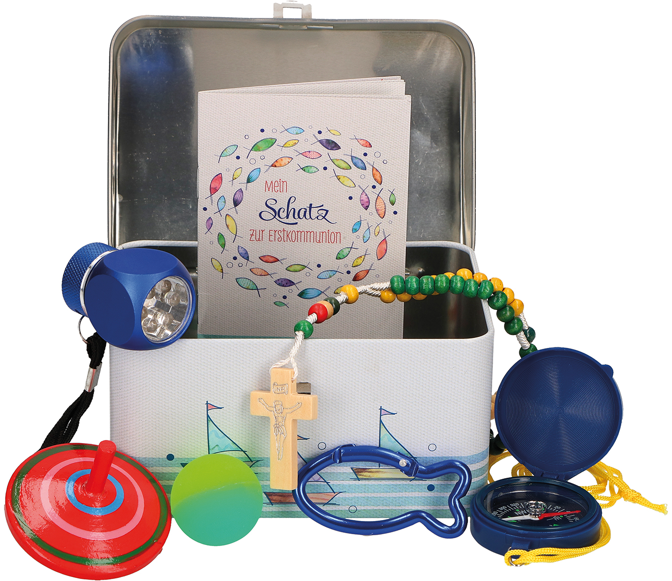 Farbig gestaltete Schatzkiste aus Metall mit Schloss, Inhalt: Begleitheft, Rosenkranz, Fisch-Karabinerhaken, Kreisel, Flummi, LED-Taschenlampe und Kompass.