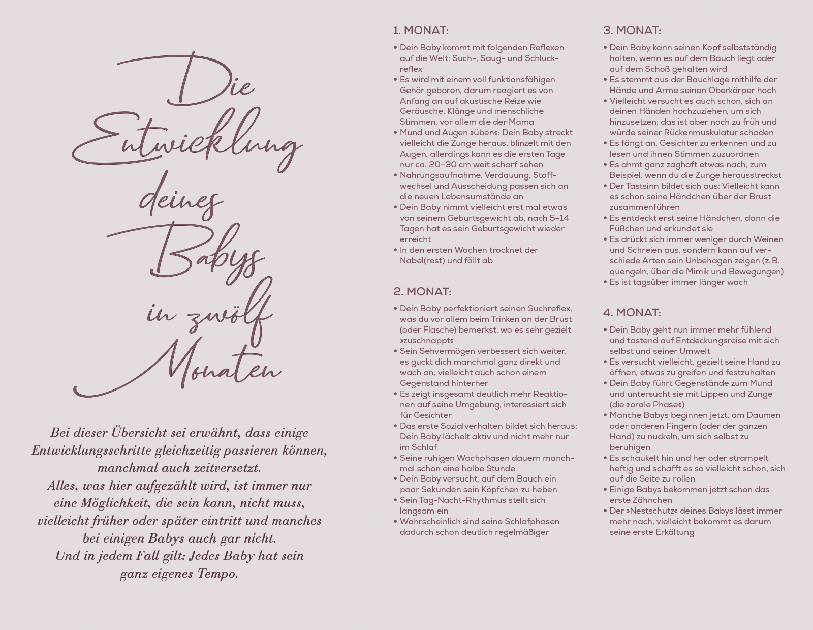 "Hallo, du Liebe, herzlichen Glückwunsch zur Geburt deines Babys! Endlich ist es da, und vor euch liegt eine wunderbare Zeit. Eins gleich vorweg: Auch wenn du dich noch so unsicher und hilflos fühlst, mache dich nicht verrückt. Höre auf die Signale, die dein Kind dir gibt. Es weiß, was es braucht, und dein Mutter-Instinkt hilft dir, seine Bedürfnisse zu erkennen. Du hast wahrscheinlich tausend Fragen, und ich verspreche dir, auf jede davon gibt es eine Antwort. Lass mich dich begleiten durch dein erstes Jahr mit Baby und dir mit meinen persönlichen Erfahrungen und meinem Wissen als vierfache Mama zur Seite stehen. Das Wichtigste: Stärke die Bindung zwischen dir und deinem Kind. Versuche es noch nicht zu erziehen oder zu trainieren, sondern achte auf seine Bedürfnisse. Alles, was es braucht, ist deine Nähe. Wenn du ihm die schenkst, benötigst du keinen Schnuller, keinen Kinderwagen und wirst deinen neuen Alltag mit vielen Freiheiten gestalten können. Vertraue auf dein Bauchgefühl, denn: Du bist die beste Mama für dein Kind!"