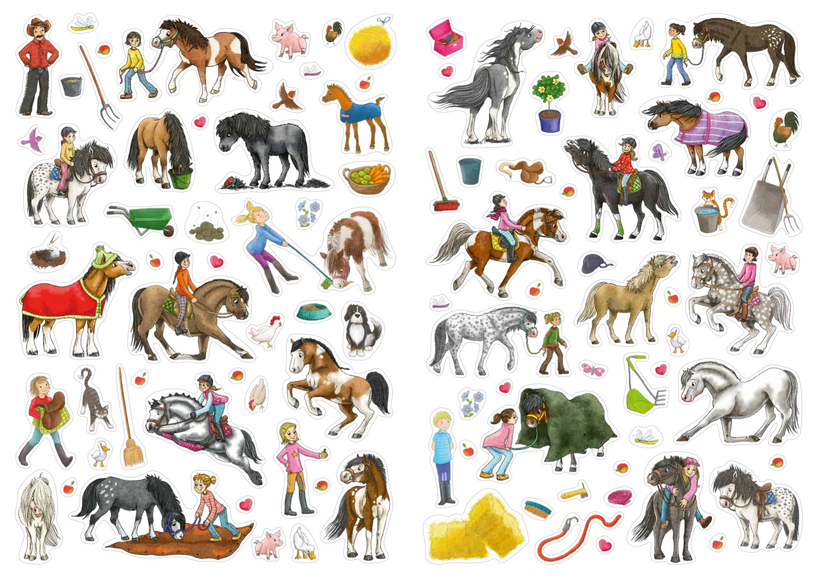 - Viele Pferde, Fohlen, Ponys, Reiterinne und Reiter in Stickerform sind in diesem Buch enthalten.