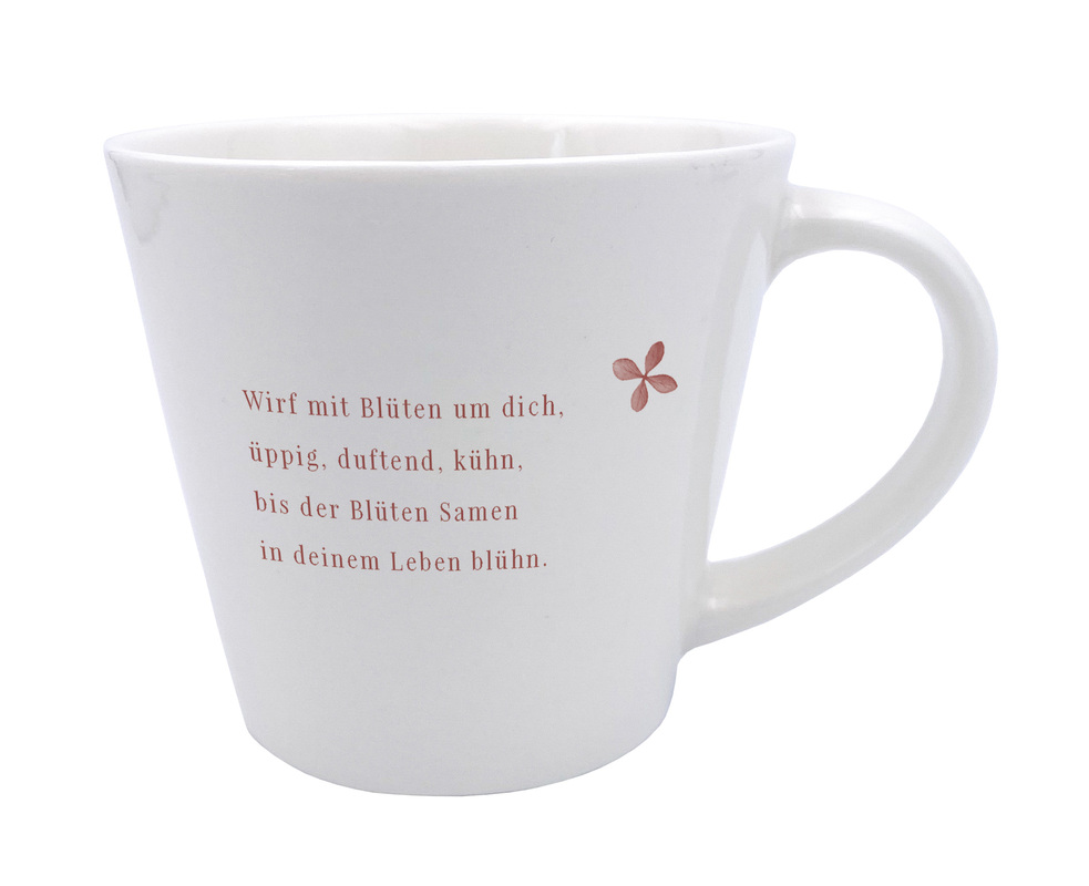 Die elegant gestaltete Tasse macht jede Kaffeepause zum Vergnügen! Mit dem Wort "aufblühen" in Kalligrafie und dem Gedicht: "Wirf mit Blüten um dich, üppig, duftend, kühn, bis der Blüten Samen in deinem Leben blühn." Die Tasse ist spülmaschinengeeignet und fasst ca. 300 ml.