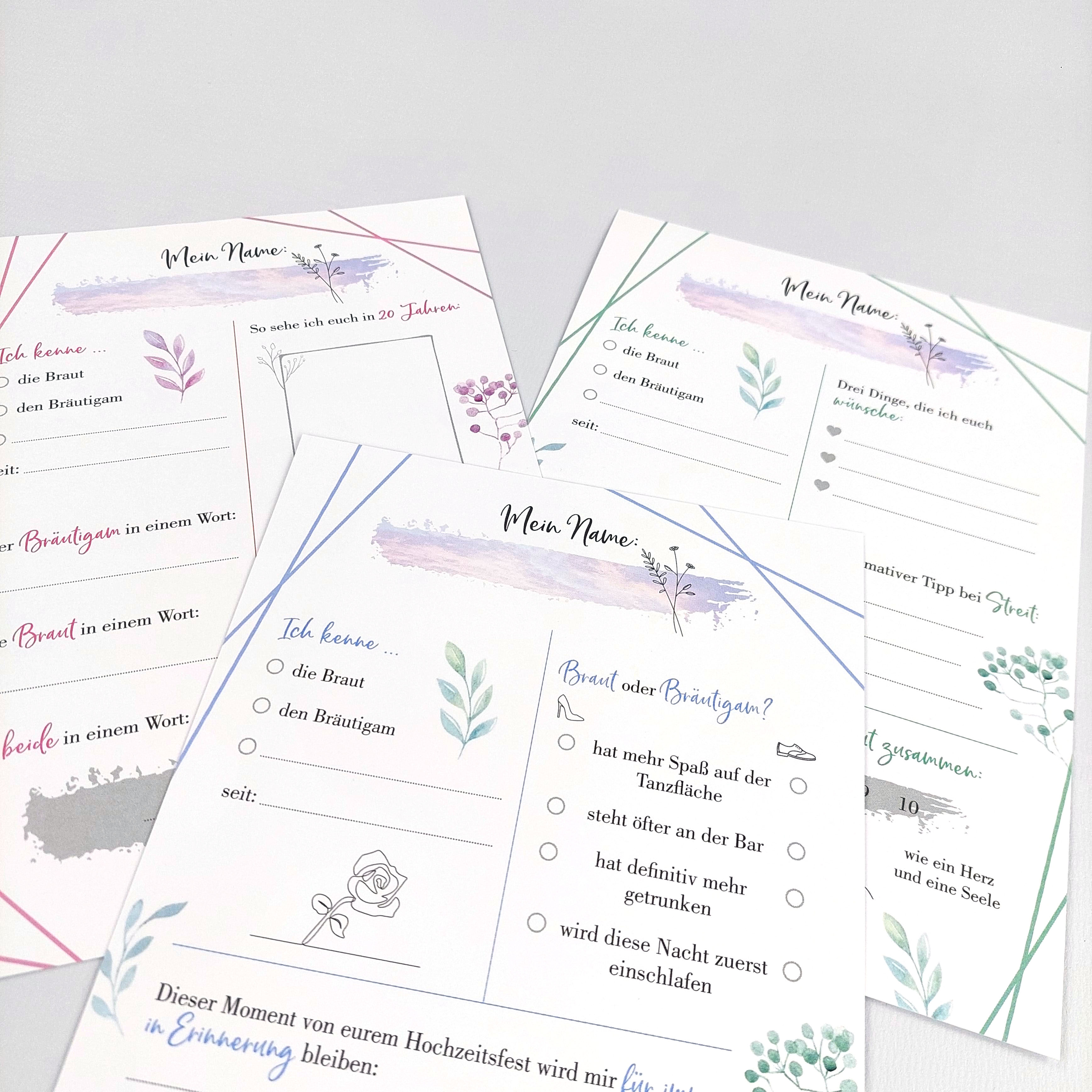 Während ein herkömmliches Gästebuch früher oder später im Regal verschwindet, können diese Gästekarten kreativ in Szene gesetzt werden: Als Collage in einem großen Bilderrahmen oder aufgehängt an Memoboards, Pinnwänden oder stylischen Fotoseilen werden sie zu einem echten Hingucker und einem einzigartigen Erinnerungsstück. Auf dem Hochzeitsfest können sie dank des praktischen Formats direkt an die Gäste oder auf den Tischen verteilt werden. Glückwünsche und unvergessliche Momente lassen sich so für immer festhalten. Die spannenden Fragen zum Ausfüllen und Ankreuzen sorgen zudem für Spaß und Abwechslung bei Gästen und Brautpaar.