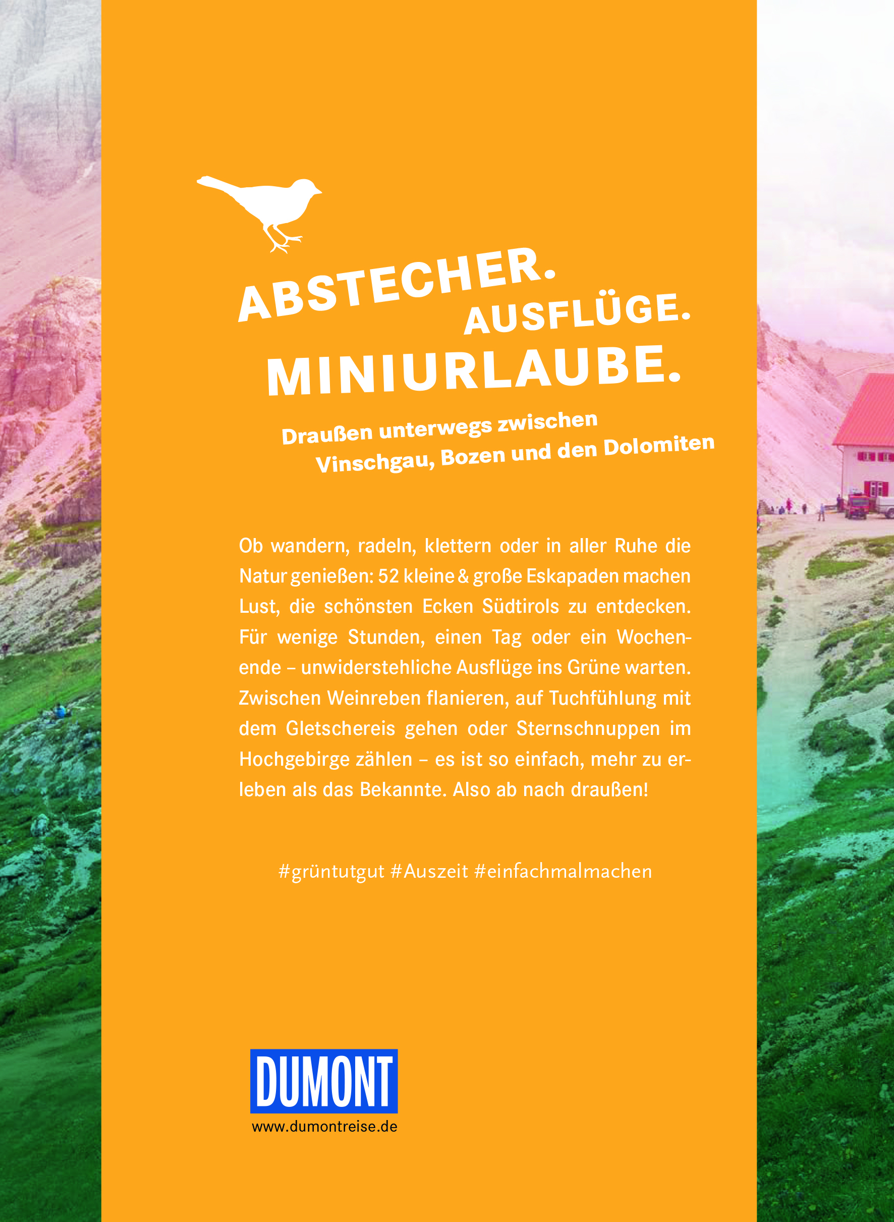 Ob wandern, radeln, paddeln oder in aller Ruhe die Natur genießen: 52 kleine und große Eskapaden machen Lust, die schönsten Ecken in Südtirol zu entdecken. Für wenige Stunden, einen Tag oder ein Wochenende - unwiderstehliche Ausflüge ins Grüne warten. Auf Tuchfühlung mit dem Gletschereis gehen, auf schmalen Pfaden zwischen Weinreben flanieren oder Sternschnuppen im Hochgebirge zählen - es ist so einfach, mehr zu erleben als das Bekannte. Also ab nach draußen!