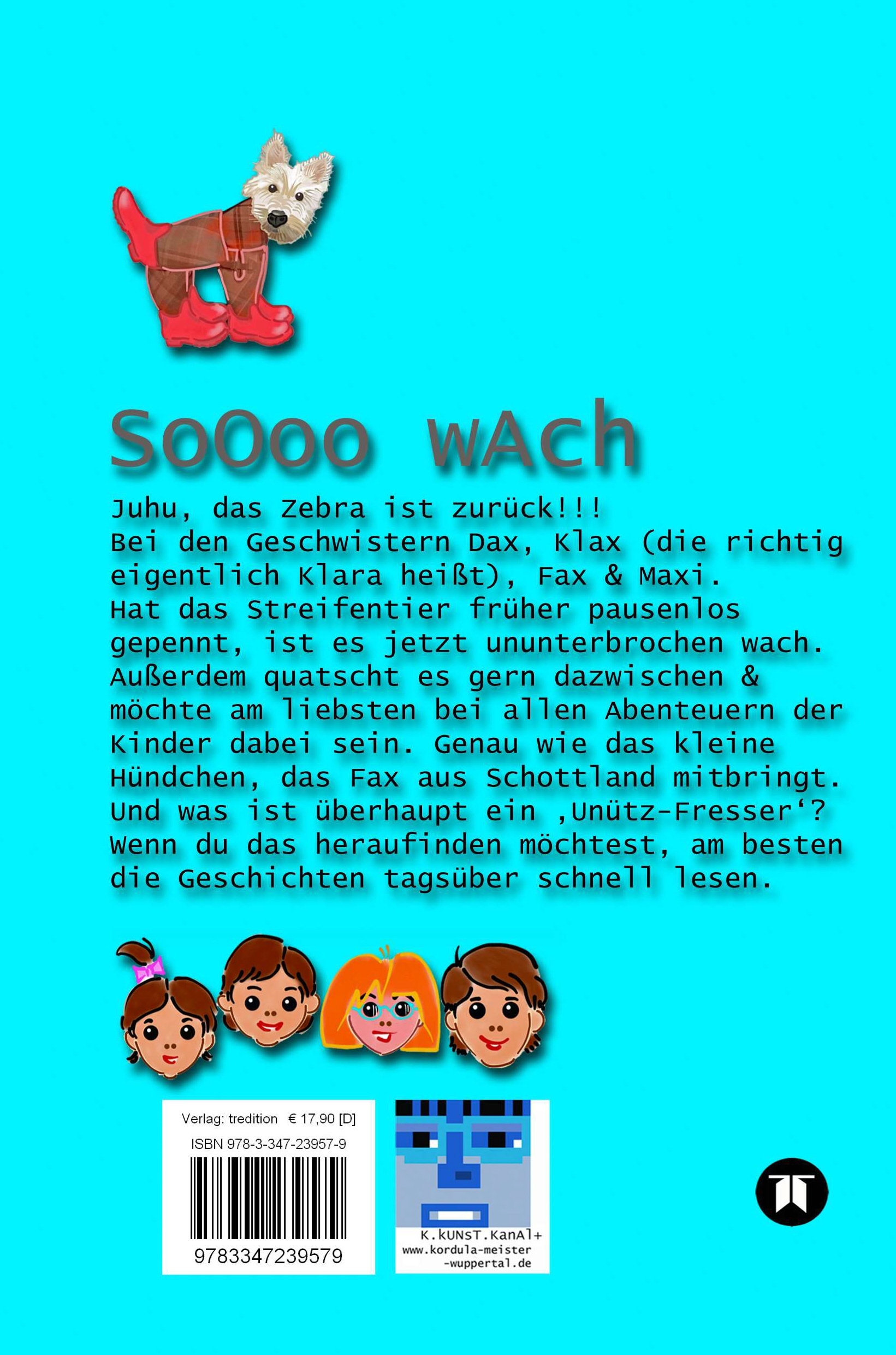 Juhu, das Zebra aus den "Zufälligen Gute-Nacht-Geschichten" ist zurück!!! Bei den Geschwistern Dax, Klax (die eigentlich Klara heißt) Fax & Maxi. Hat das Streifentier früher pausenlos gepennt, ist es jetzt ununterbrochen wach. Außerdem quatscht es gern dazwischen & möchte am liebsten bei allen Abenteuern der Kinder dabei sein. Genau wie das kleine Hündchen, das Fax aus Schottland mitgebracht hat. Und was ist denn bloß ein "Unütz-Fresser"? Wenn du das herausfinden möchtest, gibt es nur eins: am besten schnell die "Zufälligen Guten-Tag-Geschichten" lesen.