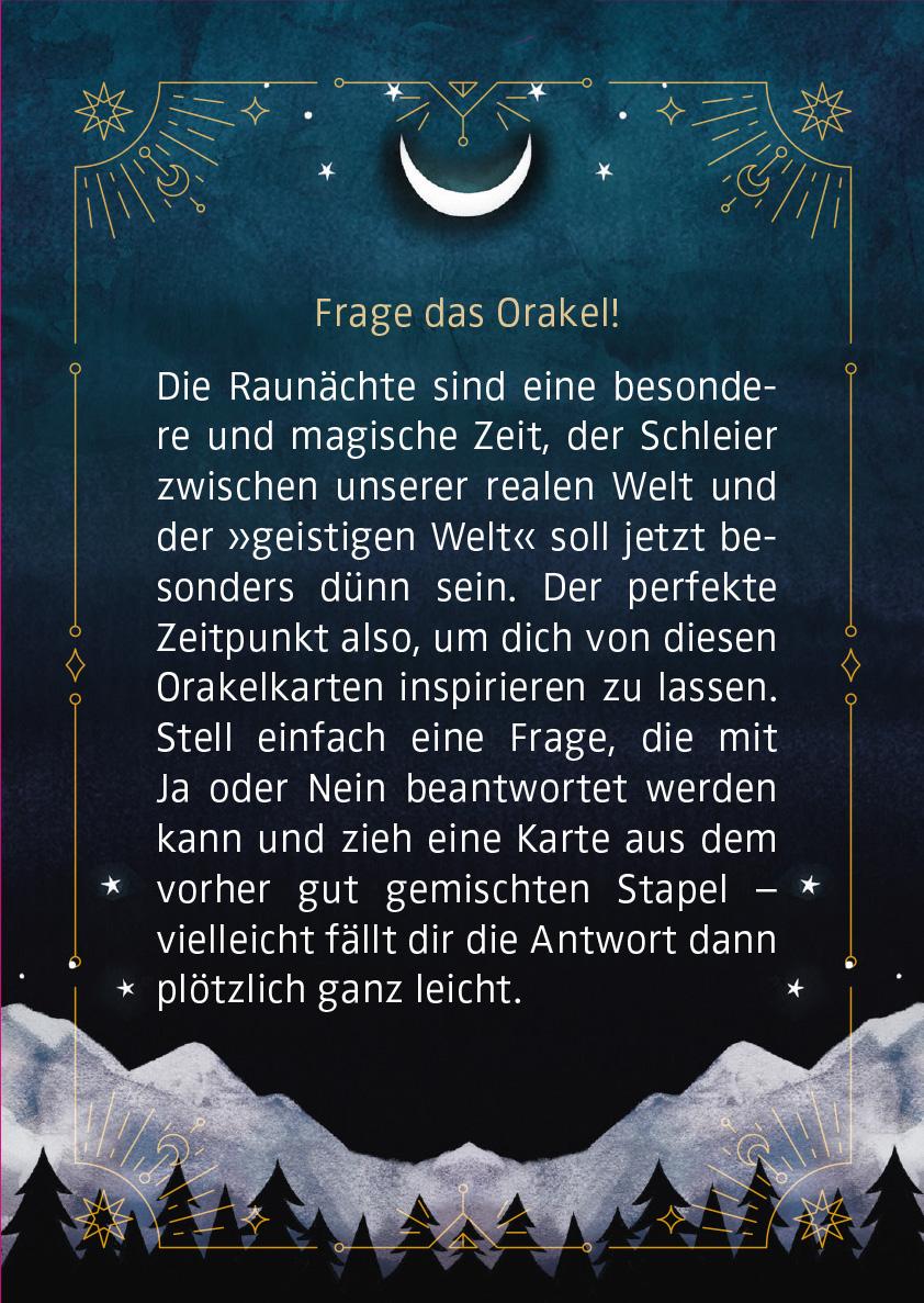 Seit Urzeiten ranken sich zauberhafte Legenden und magische Geschichten rund um die letzten Tage des alten und den Beginn des neuen Jahres. Viele Bräuche, Weisheiten und Mythen rund um die Raunächte und ihre Magie werden heute wiederentdeckt und wieder genutzt. Dieses Orakel gibt dir Antworten, die sich auf uraltes spirituelles Wissen stützen. Formuliere eine "Ja-oder-Nein-Frage", ziehe eine beliebige Karte aus dem Stapel und lass dir vom Schicksal neue Wege aufzeigen.
