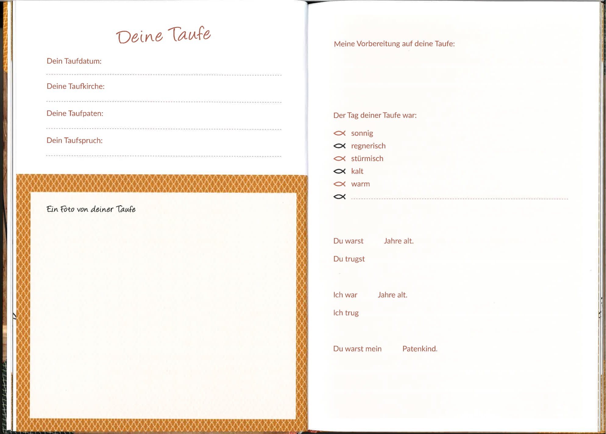 In diesem liebevoll gestalteten Ausfüllalbum können Sie mithilfe inspirierender Fragen die gemeinsame Zeit mit Ihrem Patenkind Revue passieren lassen. Sie können in Erinnerungen an gemeinsame Erlebnisse schwelgen, schöne Momente der Taufe und der Konfirmation festhalten und Wünsche für die Zukunft Ihres Patenkindes zum Ausdruck bringen. Die Fragen dienen Ihnen als Leitfaden, Sie können aber Ihrer Fantasie und Ihren Erinnerungen auf vielen Seiten freien Lauf lassen und das Album zu einem ganz besonderen Geschenk für Ihr Patenkind machen - mit individuellen Texten, Fotos und Erinnerungsschnipseln. Seien Sie dabei offen und lassen Sie Ihr Herz sprechen. Heraus kommt ein ganz persönliches Erinnerungsbuch für Ihr Patenkind, das Sie ihm am Tag der Konfirmation überreichen können.
