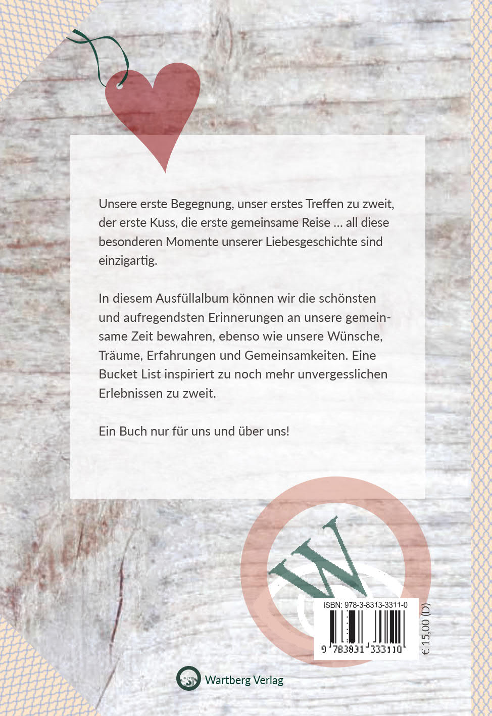 Unsere erste Begegnung, unser erstes Treffen zu zweit, der erste Kuss, die erste gemeinsame Reise ... all diese besonderen Momente unserer Liebesgeschichte sind einzigartig.In diesem Ausfüllalbum können wir die schönsten und aufregendsten Erinnerungen an unsere gemeinsame Zeit bewahren, ebenso wie unsere Wünsche, Träume, Erfahrungen und Gemeinsamkeiten. Eine Bucket List inspiriert zu noch mehr unvergesslichen Erlebnissen zu zweit.Ein Buch nur für uns und über uns!