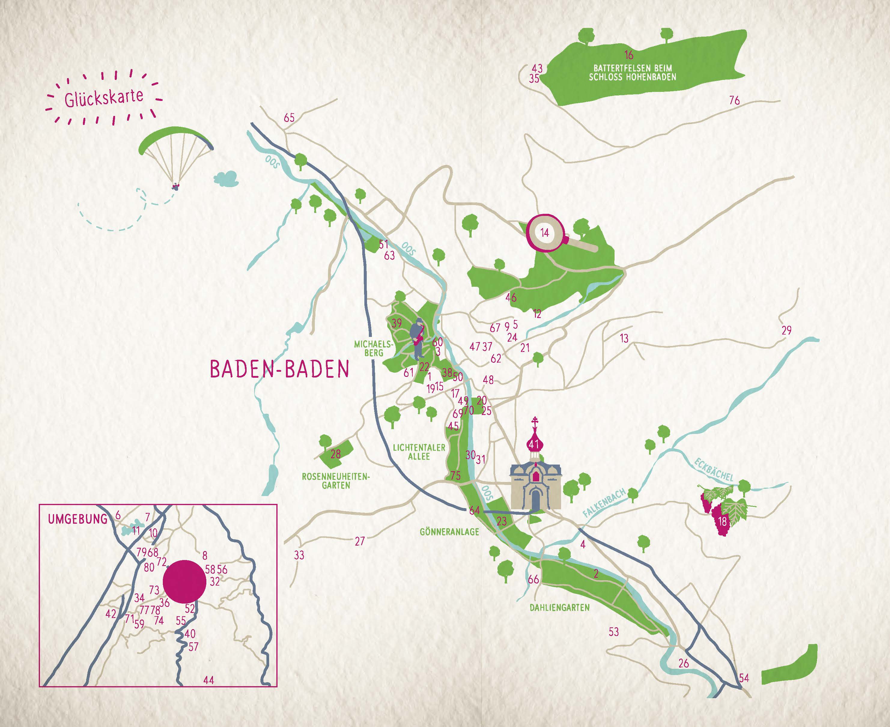 Baden-Baden ist einfach zauberhaft: Im mediterranen Klima gedeihen Zypressen, Orangen- und Zitronenbäume. Das Festspielhaus bietet mit klassischen und modernen Klängen Wellness für die Ohren. Die luxuriöse Bäderlandschaft schenkt Entspannung auf höchstem Niveau, und im berühmten Casino kann man alles auf Rot setzen und so sein Glück auf die Probe stellen. Apropos rot: Ein badischer Rotwein aus dem Umland macht das Glück im UNESCO-Welterbe an der Oos schließlich perfekt!