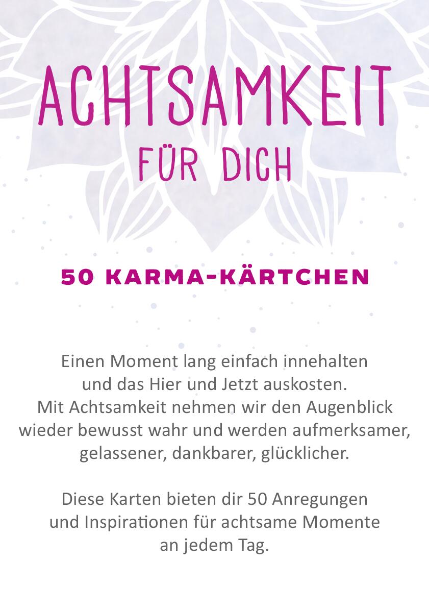 Einen Moment lang einfach innehalten ... Wenn die Gedanken sich im Kreis drehen und du nicht zur Ruhe kommst, lässt Achtsamkeit dich den Augenblick bewusst wahrnehmen. Auf diesen Karma-Kärtchen findest du Tag für Tag Inspiration, Anregungen und Tipps, um dich zu erden und wieder aufmerksam, dankbar, gelassen und glücklich zu werden. Für achtsame Momente im Alltag: bei deiner Morgenroutine, in der S-Bahn oder einfach zwischendurch.