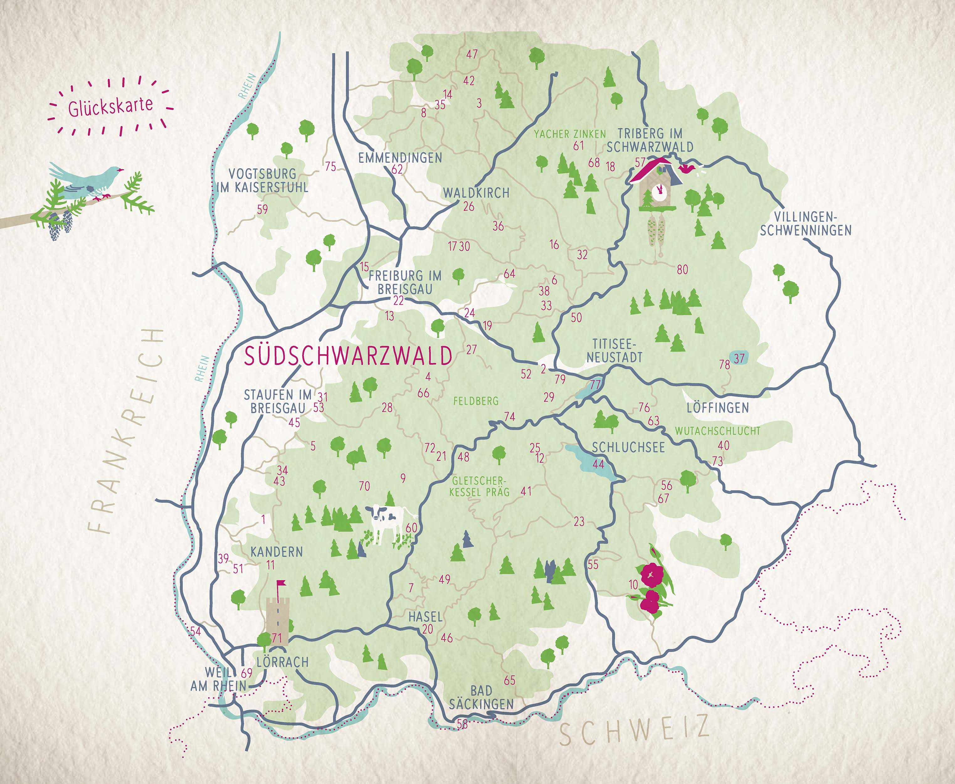 Im Südschwarzwald lauert das Glück überall: Es wohnt zwischen mächtigen Tannen, an verzauberten Seen und in idyllischen Dörfern. Häufig winkt es einem von romantischen Burgruinen zu, manchmal trägt es Wanderschuhe oder genießt bei einem Gläschen Wein den Sonnenuntergang, und hin und wieder zergeht es auf der Zunge wie eine frische Eiskugel. Anne Grießer verrät, wo man dem Glück zwischen Lörrach, Löffingen, Waldkirch und Kaiserstuhl jederzeit einen Besuch abstatten kann!
