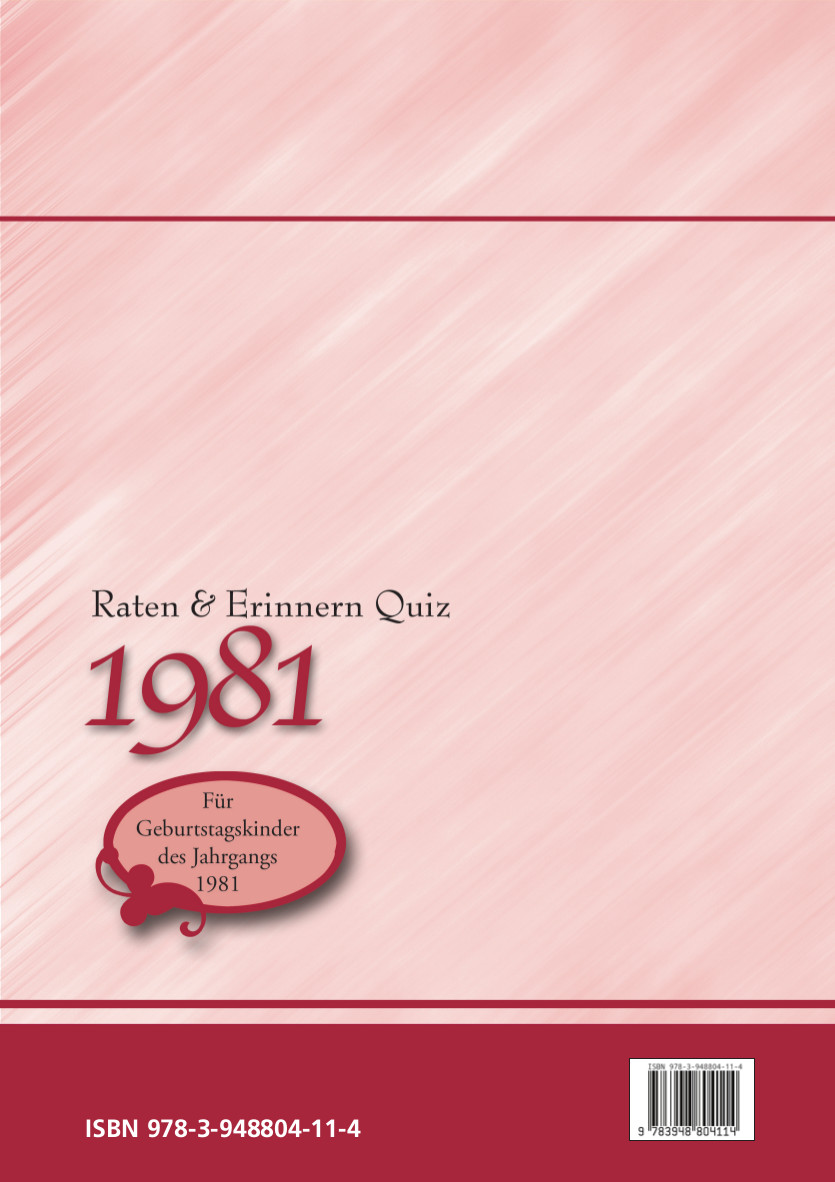 Dieser Quizband wurde speziell für Geburtstagskinder des Jahres 1981 zusammengestellt. Die Fragen im ersten Teil führen zurück in dieses Jahr, in dem Bundeskanzler Helmut Schmidt die DDR besuchte und Erich Honecker traf. 1981 war das Jahr, in dem es in Deutschland Großdemonstrationen für Frieden und Abrüstung und gegen Atomkraftwerke gab. Ronald Reagan trat in den USA sein Amt an. Lady Diana Spencer und Prinz Charles heirateten und in der ARD lief die erste Folge von „Dallas“.