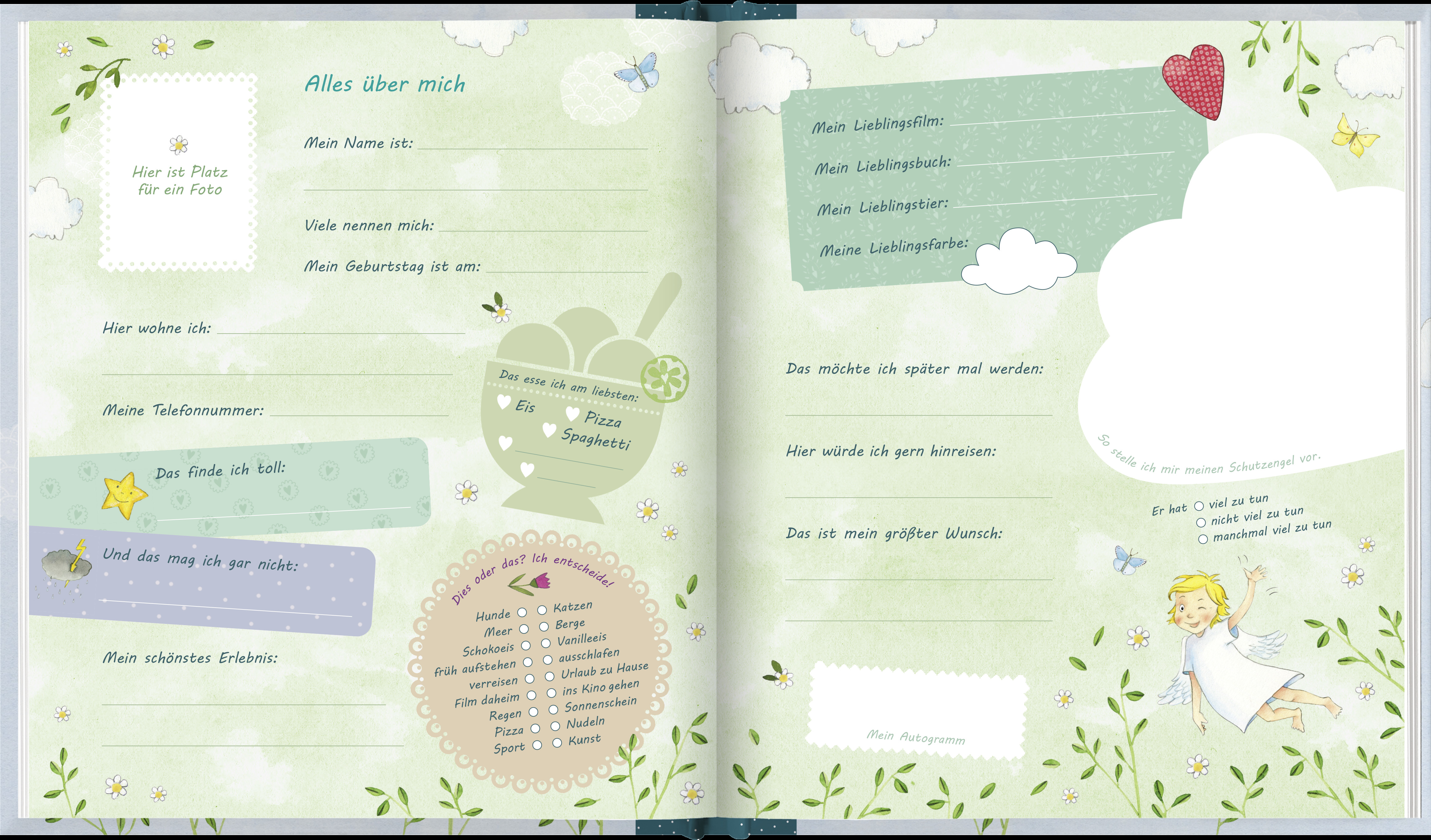 Durchgehend illustriert mit dem niedlichen Schutzengel von Katja Jäger, ist das Eintragbuch Mein Schutzengel ein schönes Geschenk zur Erstkommunion oder zum Geburtstag. Mit dem Freundebuch können Kinder im Grundschulalter Erinnerungen an ihre Freunde und Klassenkameraden sammeln: Es bietet viel Platz für Fotos oder Zeichnungen, außerdem regen kindgerechte Fragen die Fantasie an und festigen die Freundschaft. Das Eintragbuch ist ein Geschenk, an dem Kinder lange Freude haben, und das wertvolle Erinnerungen fürs Leben festhält.