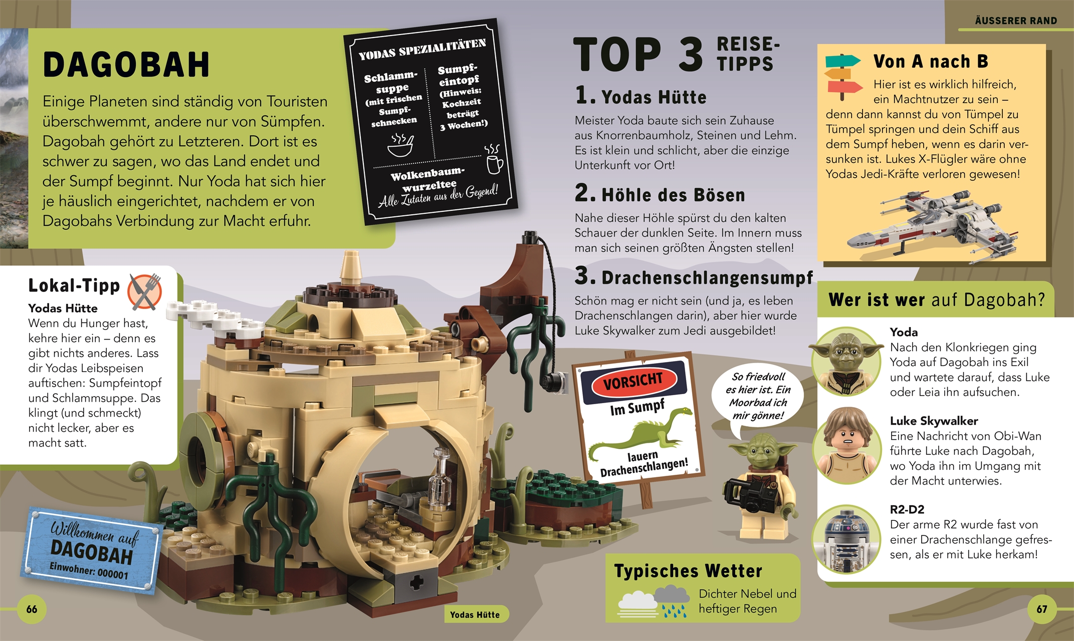 Vom Wüstenplaneten Tatooine über die Eiswelt Hoth bis hin zu seinem Sumpfversteck auf Dagobah der legendäre Jedi-Meister Yoda präsentiert die 25 faszinierendsten Welten der Star Wars Galaxis. Dabei erfahren Fans alles über die Gefahren und Geheimnisse der Planeten. Damit sie optimal für die galaktischen Abenteuer gerüstet sind, ist die exklusive Yoda Minifigur mit Stab, Rucksack, Kamera und Karte ausgestattet.