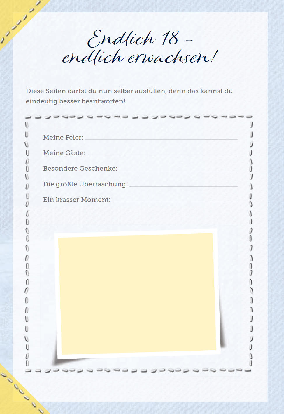 | Schlagworte | 18 • 18. • 18. Geburtstag • allerbester Sohn • allerbeste Tochter • Ausfüllbuch • besonderes Geschenk zum 18. • DIY • Eintragbuch • Eintragbuch (Papeterie) • Erinnerungsalburm • Geburtstag • Geschenk • Geschenkbuch • Junge • Mädchen • persönliches Geschenk • persönliches Geschenk zum 18. • Sohn • Tochter • Volljährig • Volljährigkeit |