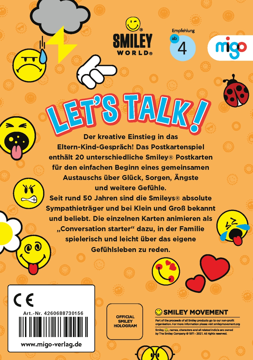 Manchmal ist es nicht so leicht, wenn Eltern mit ihren Kindern über Emotionen und Glück sprechen wollen. Wie gelingt der Gesprächseinstieg? Wie wird bei den Kindern das Interesse dafür geweckt? Und wie kann das alles zu einem großen gemeinsamen Spaß werden? Das Smiley® Postkartenspiel bietet einen kreativen Ansatz, um alle Famillienmitglieder über ihre Gefühle in den Austausch zu bringen. Seit rund 50 Jahren sind die Smileys® absolute Sympathieträger und bei Klein und Groß bekannt und beliebt. Die einzelnen Karten animieren als "Conversation starter" dazu, spielerisch und leicht über das eigene Gefühlsleben zu reden. Im Mittelpunkt stehen dabei immer der Austausch zwischen Eltern und Kindern sowie die gemeinsam verbrachte Zeit. Denn Familienzeit ist Glückszeit.