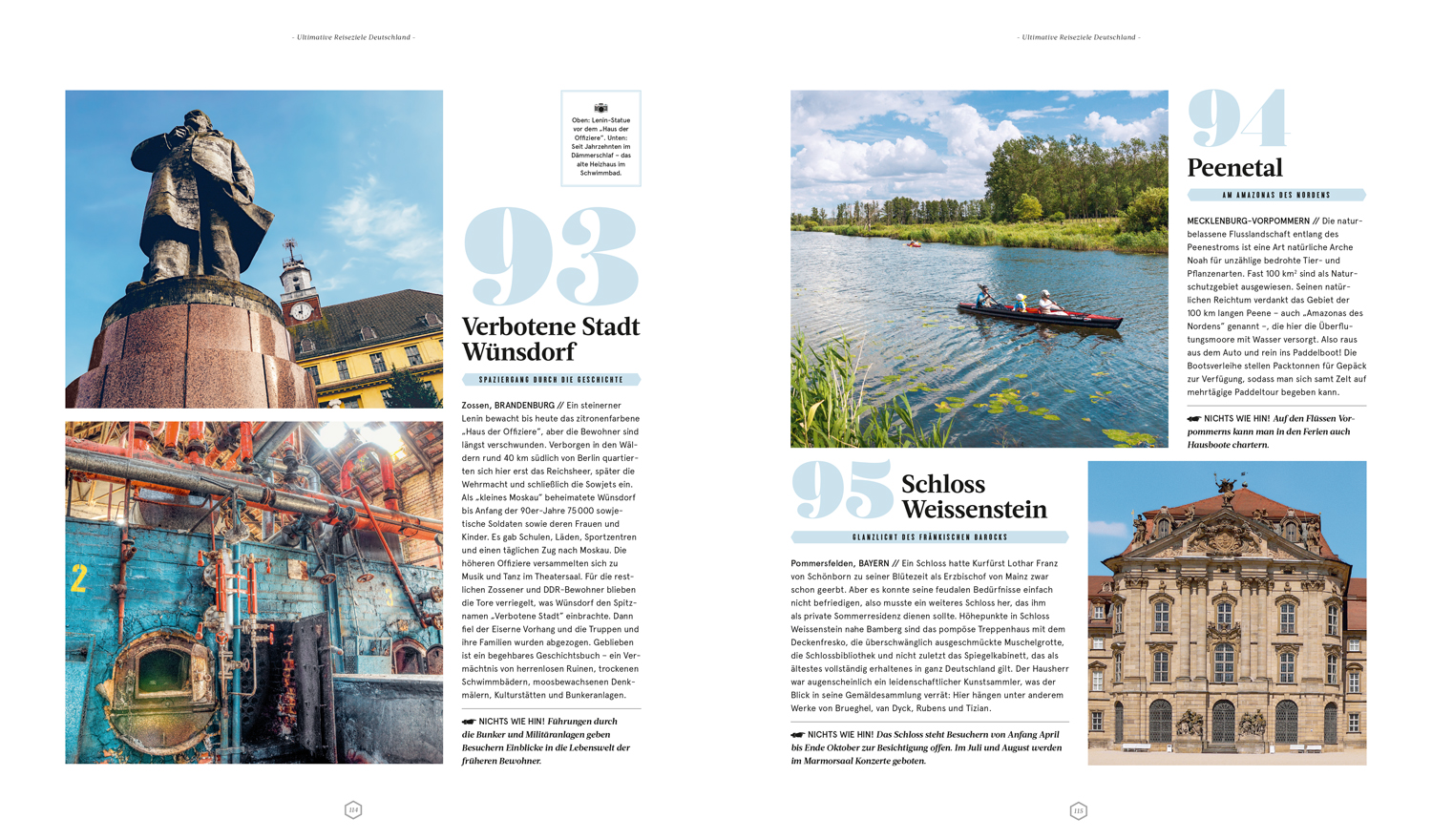 Ob Klimahaus Bremerhaven oder die schwindelerregende Hängeseilbrücke Geierlay im Hunsrück - die ultimative Bestenliste hält viele Überraschungen bereit! Jede Sehenswürdigkeit wird mit großformatigen Fotos und beschreibenden Text vorgestellt, abgerundet mit einem praktischen Tipp.