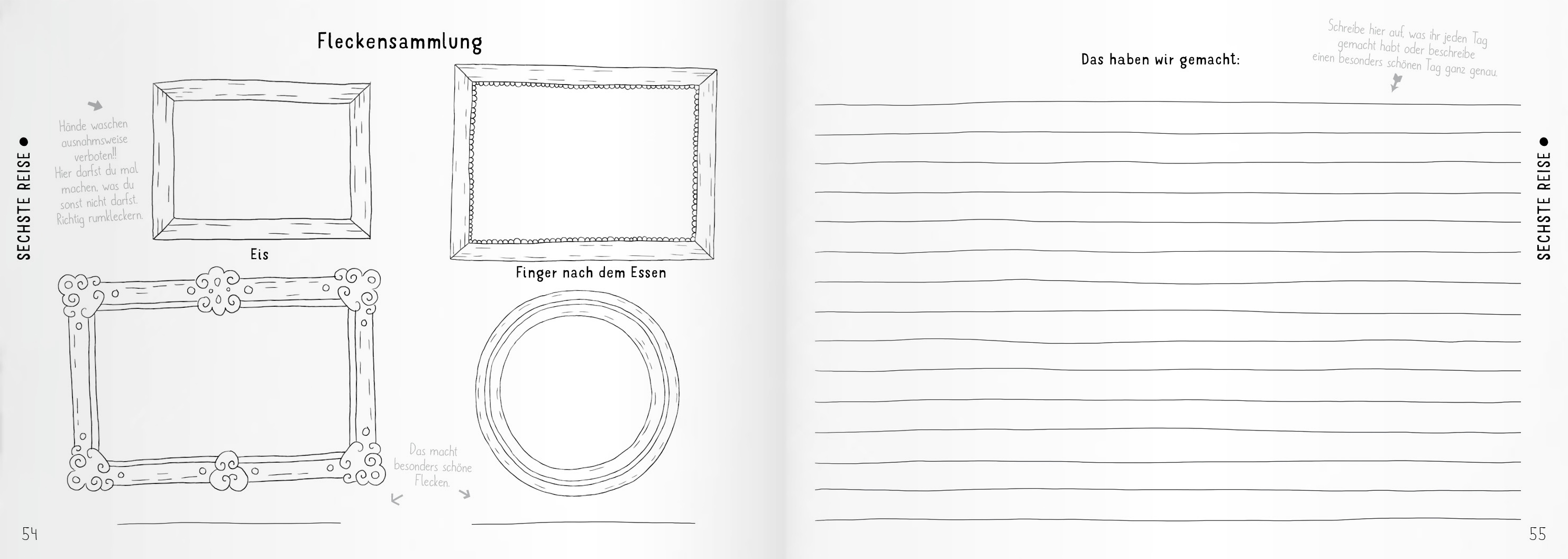 Es enthält dazu jede Menge kreative Anregungen auch ungewöhnliche Erinnerungen zu notieren und dazu JEDE MENGE KLEINE IDEEN, um aus dem Buch ein ganz persönliches Buch zu machen: Zum Beispiel in dem man gemeinsam eine eigene Reisekollektion entwirft, eine Mini-Sandsammlung anlegt oder nach Anleitung ein kleines Theaterstück improvisiert.