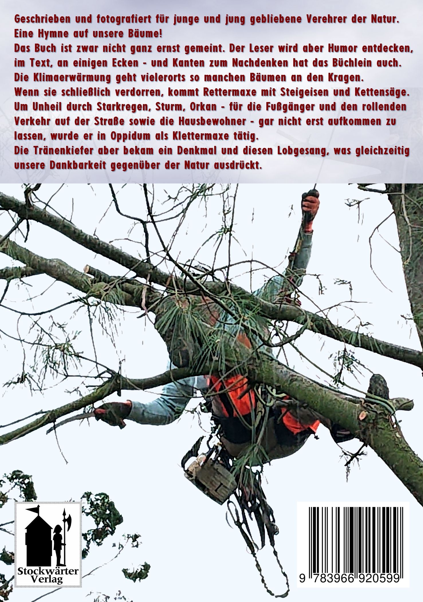Die Klimaerwärmung geht vielerorts so manchen Bäumen an den Kragen. Wenn sie schließlich verdorren, kommt Rettermaxe mit Steigeisen und Kettensäge. Um Unheil durch Starkregen, Sturm, Orkan - für die Fußgänger und den rollenden Verkehr auf der Straße sowie die Hausbewohner - gar nicht erst aufkommen zu lassen, wurde er in Oppidum als Klettermaxe tätig.