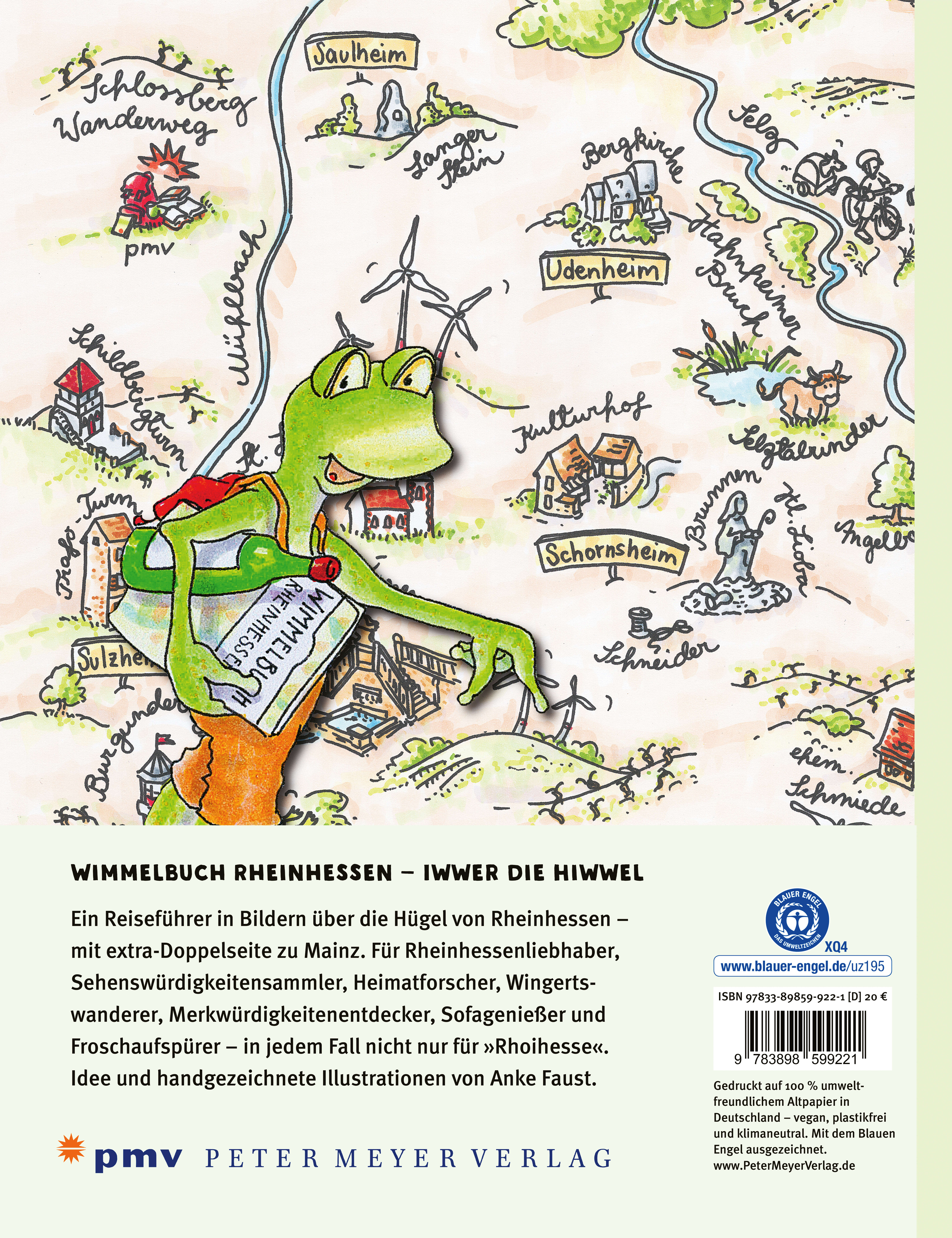 Ein Reiseführer in Bildern - oder ein Wimmelbuch für Rheinhessen-Liebhaber? An diesem handgezeichneten Atlas haben alle Genießer Freude: Auf 32 A4-großen Seiten fächert sich die Landschaft von Rheinhessen mit all ihren Sehenswürdigkeiten, Ruinen, Türmen, Bächen und Windrädern auf. Orte und Attraktionen sind lagerichtig von Hand gezeichnet und beschriftet. Die Hauptstadt Mainz und ihre Attraktionen wie Dom und Schloss werden auf einer extra Doppelseite dargestellt. Ein hübscher Geschenkband für Einheimische und Touristen. Entdecken Sie das »Land der 1000 Hiwwel« (Weinbergshügel) und freuen Sie sich an den kleinen Wanderern und Radlern, den Familien mit Hündchen und dem kleinen, grünen Frosch. Ihn aufzuspüren, macht auch Kindern Spaß. Die Großen freuen sich über eine Liste der Märkte und Feste sowie die umweltfreundliche Machart des hochwertigen Geschenkbuches.