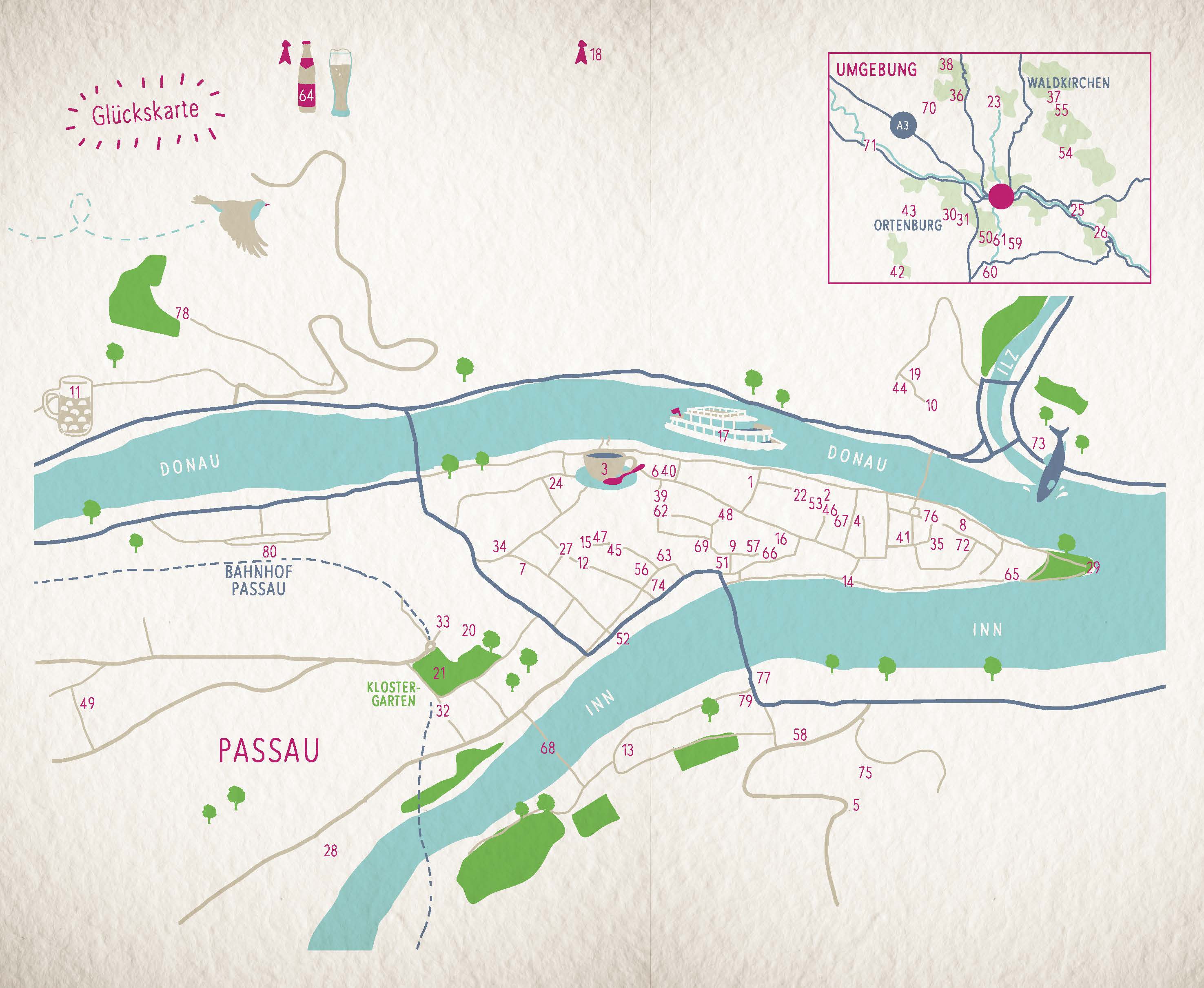 Eine Stadt, drei Flüsse, 80 Glücksorte - das ist die Glücksgleichung für Passau. Den Bayerischen Wald direkt vor der Tür und die Alpen im Rücken zieht die ehemalige Residenzstadt Glückssuchende geradezu magisch an. Ob bei Jazz im Rathaushof, beim Entspannen am sonnigen Innkai oder dem Feierabendbier unter schattigen Kastanien: Mit ihrer Mischung aus studentischer Lebenslust, kleinstädtischem Idyll und italienischem Flair macht die Dreiflüssestadt jeden glücklich!