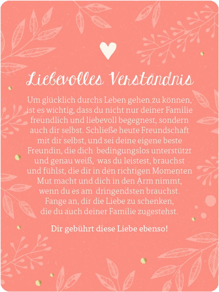 Mama zu sein, ist so turbulent wie wunderbar, voller Herausforderungen und neuer unvergleichlicher Emotionen. Wie schön, dass du diesem Abenteuer mit mehr Gelassenheit und mehr Zeit-für-dich-Momenten begegnen möchtest. Diese Karten helfen dir mit kleinen Achtsamkeitsübungen, inspirierenden Texten und einfachen Meditationen, Tag für Tag wohltuende Auszeiten in deinen Familien-Alltag einzubauen. Sie lassen dich durchatmen und führen dich zu mehr innerer Klarheit und Balance. So wirst du bewusster all die Wunder wahrnehmen können, die das Leben als Mama für dich bereithält. Viel Freude dabei!
