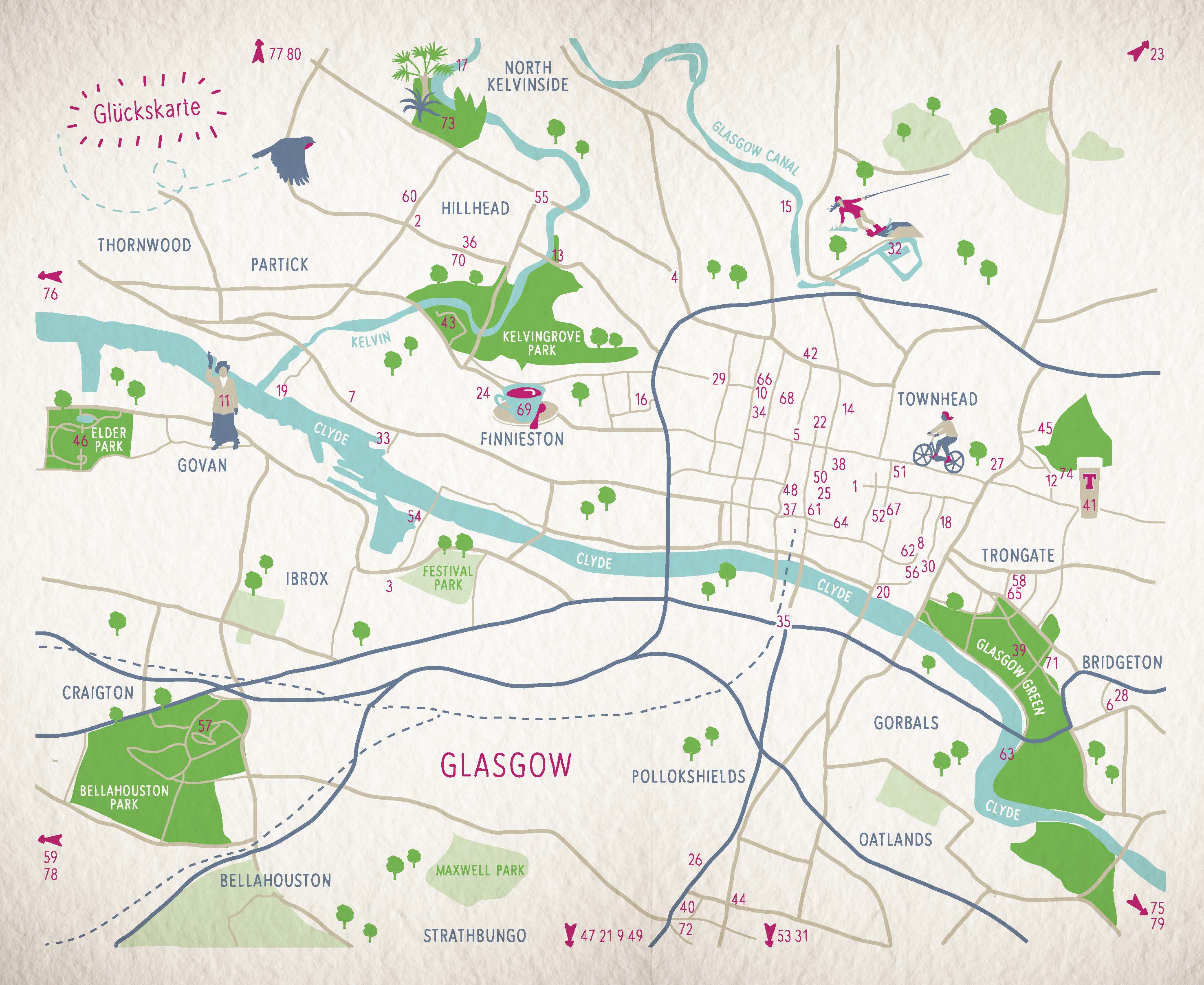 Fáilte gu Glaschu - Willkommen in Glasgow! Zwischen mittelalterlichen Ruinen und Perlen der viktorianischen Architektur warten zottelige Hochlandkühe, romantische Kanäle und eine lebhafte Kreativszene auf den Besucher. Ob auf Kneipentour durch Finnieston oder mit dem Fahrrad entlang des Flusses Clyde, beim traditionellen Afternoon-Tea oder doch beim hochprozentigen Whisky-Tasting: Mit Kathi Kamleitners Auswahl von 80 einzigartigen Orten wird das Glücklichsein zum Kinderspiel.