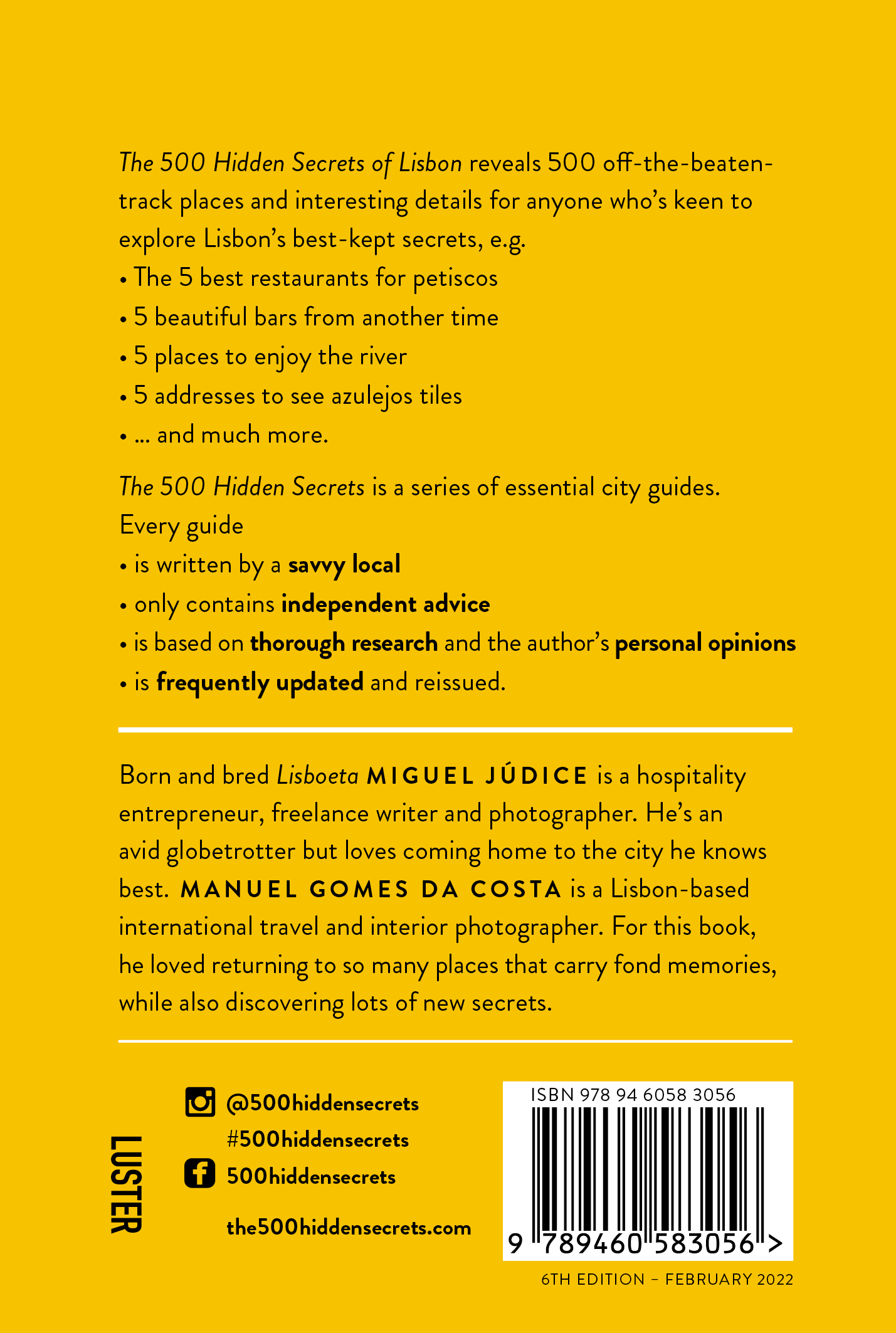 Where are the 5 best places to eat like a Portuguese? Which are the 5 best restaurants for Petiscos? Where can you find the nicest salons and barber shops? Which are the 5 best places to see Azulejos? Where will you find the most unique lifts and elevators? The best Lisbon area beaches? The 500 Hidden Secrets of Lisbon reveals these good-to-know places and many more. An affectionate and informed guide to Lisbon, written by a true local.