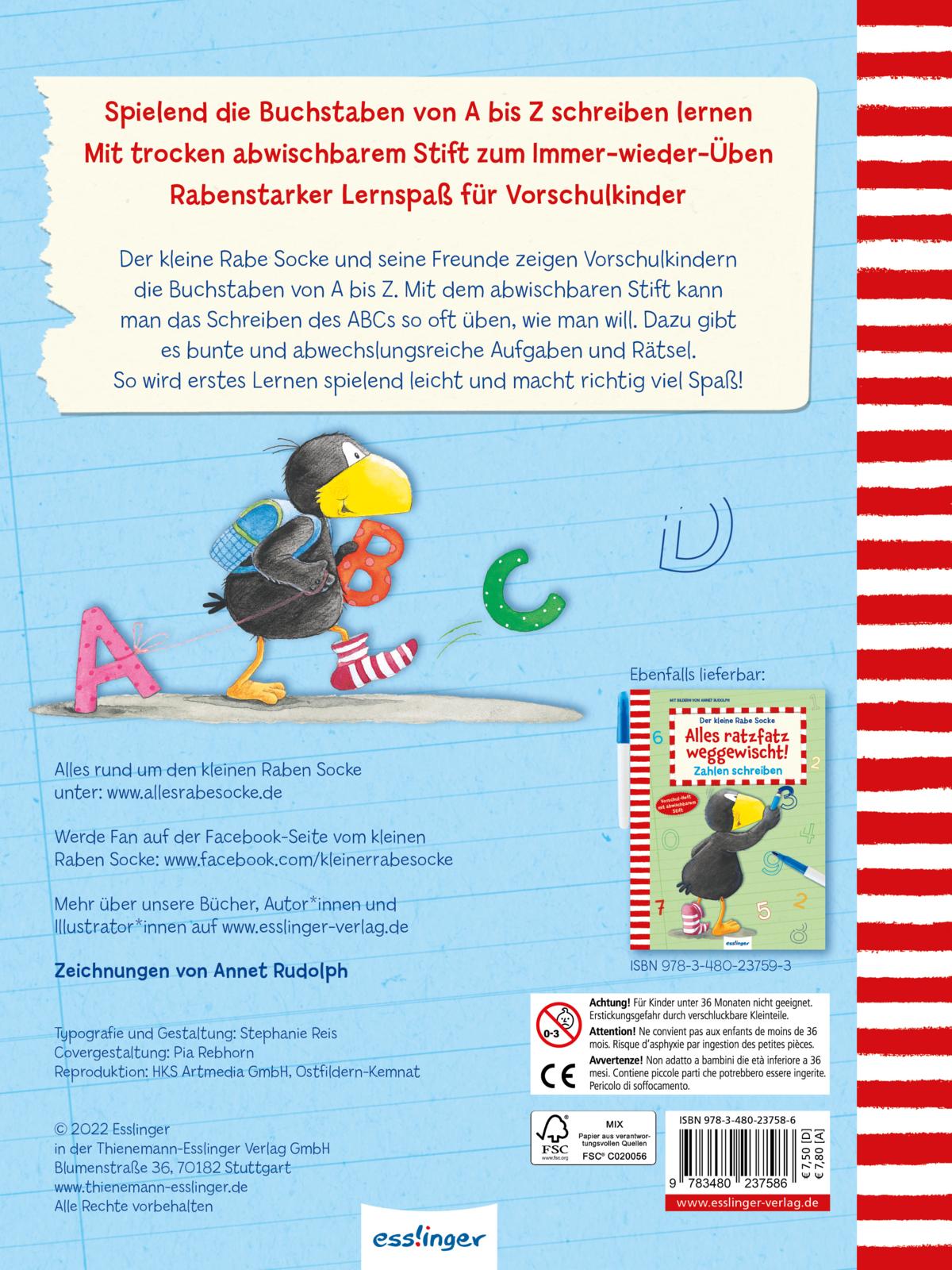Der kleine Rabe Socke und seine Freunde zeigen Vorschulkindern die Buchstaben von A bis Z. Mit Buchstaben zum Nachfahren und Ausmalen, Grundformen der Buchstaben zum Nachzeichnen und Üben und tollen Bildwörterrätseln zum Wiedererkennen und Erlernen der Buchstaben. Mit den Mal- und Schreibübungen trainieren die Kinder ihre motorischen Fähigkeiten, genaues Hinsehen, Konzentration und die Schreibhand. Dank trockenem und rückstandslos abwischbarem Stift können kleine Fehler sofort korrigiert und die Aufgaben und Übungen beliebig oft wiederholt werden!