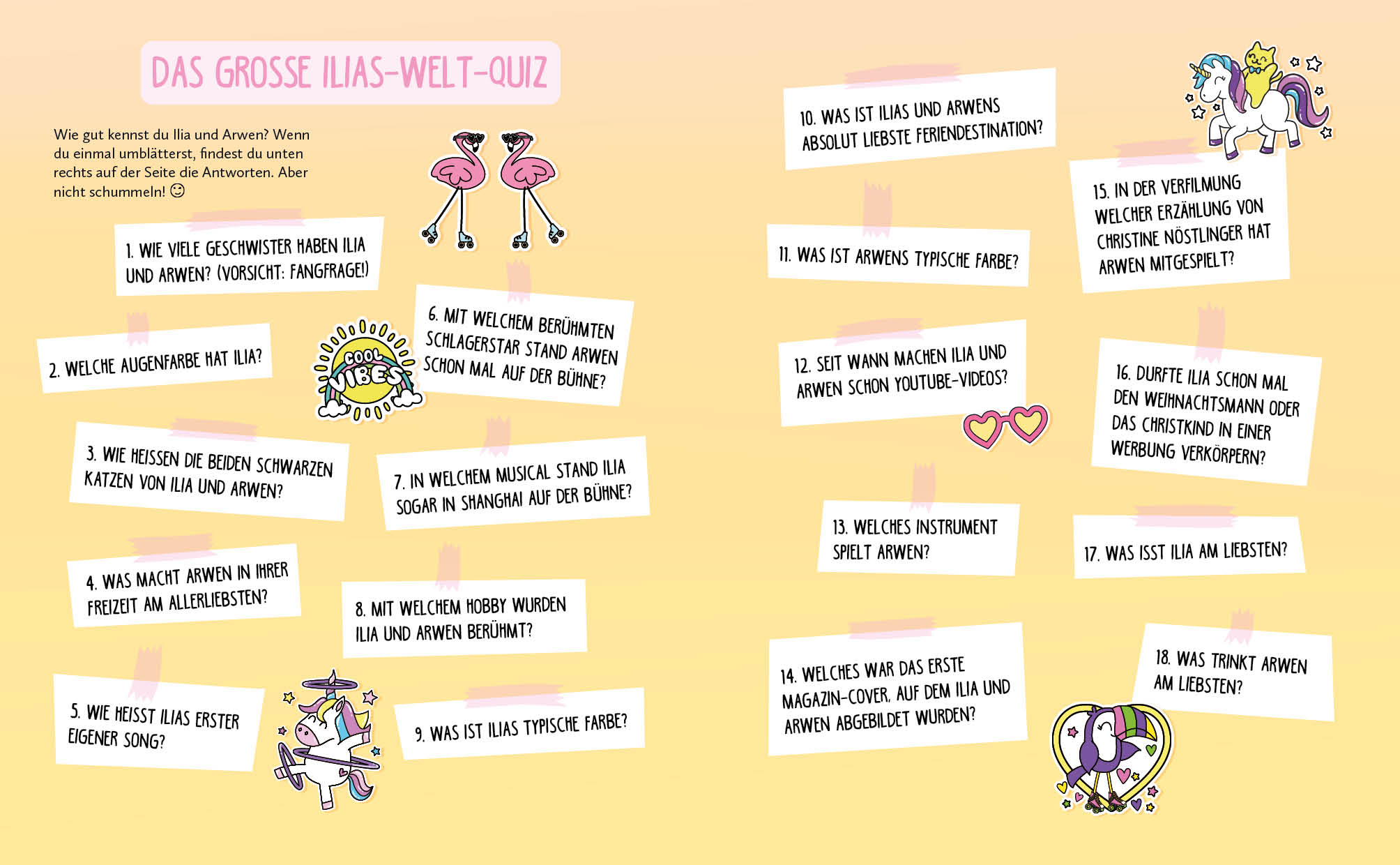 Das erste Freundebuch von Ilias Welt bietet viel Platz für persönliche Einträge und Fotos deiner Freundinnen. Außerdem gibt es einen Geburtstagskalender, coole Mittmachseiten, ein Freundschaftsketten-DIY und die besten Tipps der Mädels für tolle BFF-Aktionen. Wie gut kennst du Arwen und Ilia? In persönlichen Steckbriefen verraten die YouTuberinnen lustige Facts rund um Ilias Welt. Zudem kannst du dein Wissen im ultimativen Ilias Welt-Quiz testen.