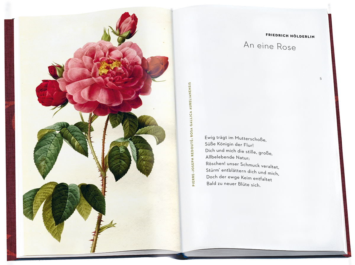 JOHANN WOLFGANG GOETHE: Als Allerschönste bist du anerkannt ANGELUS SILESIUS: Die Ros ist ohn warum BARTHOLD HEINRICH BROCKES: Flammende Rose, Zierde der Erden FRIEDRICH HÖLDERLIN: An eine Rose FRIEDRICH RÜCKERT: Die Rose RAINER MARIA RILKE: Rose, du thronende ANONYM: Uns hat eine Ros ergetzet KARL KROLOW: Rosenzauber CLEMENS BRENTANO: Die Rose blüht, ich bin die fromme Biene ROSE AUSLÄNDER: Der Garten HERMANN LÖNS: Der Rosengarten CHRISTIAN MORGENSTERN: Von den heimlichen Rosen GERTRUD KOLMAR: Die schönen Wunder GEORG VON DER VRING: Die letzte Rose INGEBORG BACHMANN: Schatten Rosen Schatten RAINER MARIA RILKE: Das Roseninnere ELISABETH LANGGÄSSER: Die Rose ADELBERT VON CHAMISSO: Rose, Rose, Knospe gestern HANS ARP: Der Engel und die Rose HEINRICH HEINE: Der Schmetterling ist in die Rose verliebt EVA STRITTMATTER: Ornament HEINRICH KRAUS: Haiku RUDOLF G. BINDING: Rosenhag ANONYM: Sub Rosa MAX HERRMANN-NEISSE: Die Rose für den Dichter HEINRICH HEINE: Leise zieht durch mein Gemüt KURT MARTI: der rat der rose FRIEDRICH HEBBEL: Wenn die Rosen ewig blühten WILHELM MÜLLER: Tränen und Rosen JOHANN WOLFGANG GOETHE: Heidenröslein WILHELM BUSCH: Die Rose sprach zum Mägdelein NIKOLAUS LENAU: An die Entfernte ELSE LASKER-SCHÜLER: Kühle FRIEDRICH GOTTLIEB KLOPSTOCK: Das Rosenband HERMANN HESSE: Verwelkende Rosen YVAN GOLL: Wo hatte ich alle meine Rosen gelassen? ELSE LASKER-SCHÜLER: Sinnenrausch KARL NEUBERGER: wandeln bunte roben RAINER MARIA RILKE: Wilder Rosenbusch GOTTFRIED BENN: Rosen WOLFGANG BORCHERT: Der Wind und die Rose FRITZ DEPPERT: Novembergarten LUISE ASTON: Die wilde Rose EUGEN ROTH: Die Rose PAUL CELAN: Stille! ELISABETH VON ÖSTERREICH: Du sandtest mir blühende Rosen NACHWORT VERZEICHNIS DER AUTORINNEN UND AUTOREN, GEDICHTE UND DRUCKVORLAGEN VERZEICHNIS DER KÜNSTLERINNEN UND KÜNSTLER, GEMÄLDE UND ZEICHNUNGEN
