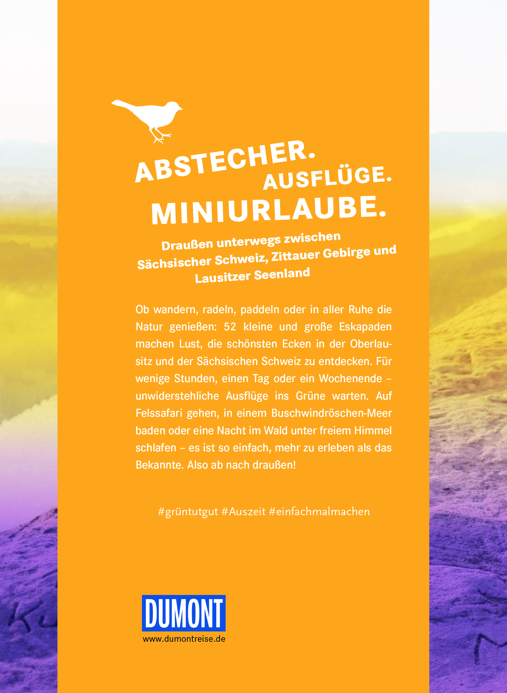 Ob wandern, radeln, paddeln oder in aller Ruhe die Natur genießen: 52 kleine und große Eskapaden machen Lust, die schönsten Ecken in der Oberlausitz und der Sächsischen Schweiz zu entdecken. Für wenige Stunden, einen Tag oder ein Wochenende - unwiderstehliche Ausflüge ins Grüne warten. Auf Felssafari gehen, in einem Buschwindröschen-Meer baden oder eine Nacht im Wald unter freiem Himmel schlafen - es ist so einfach, mehr zu erleben als das Bekannte. Also ab nach draußen!