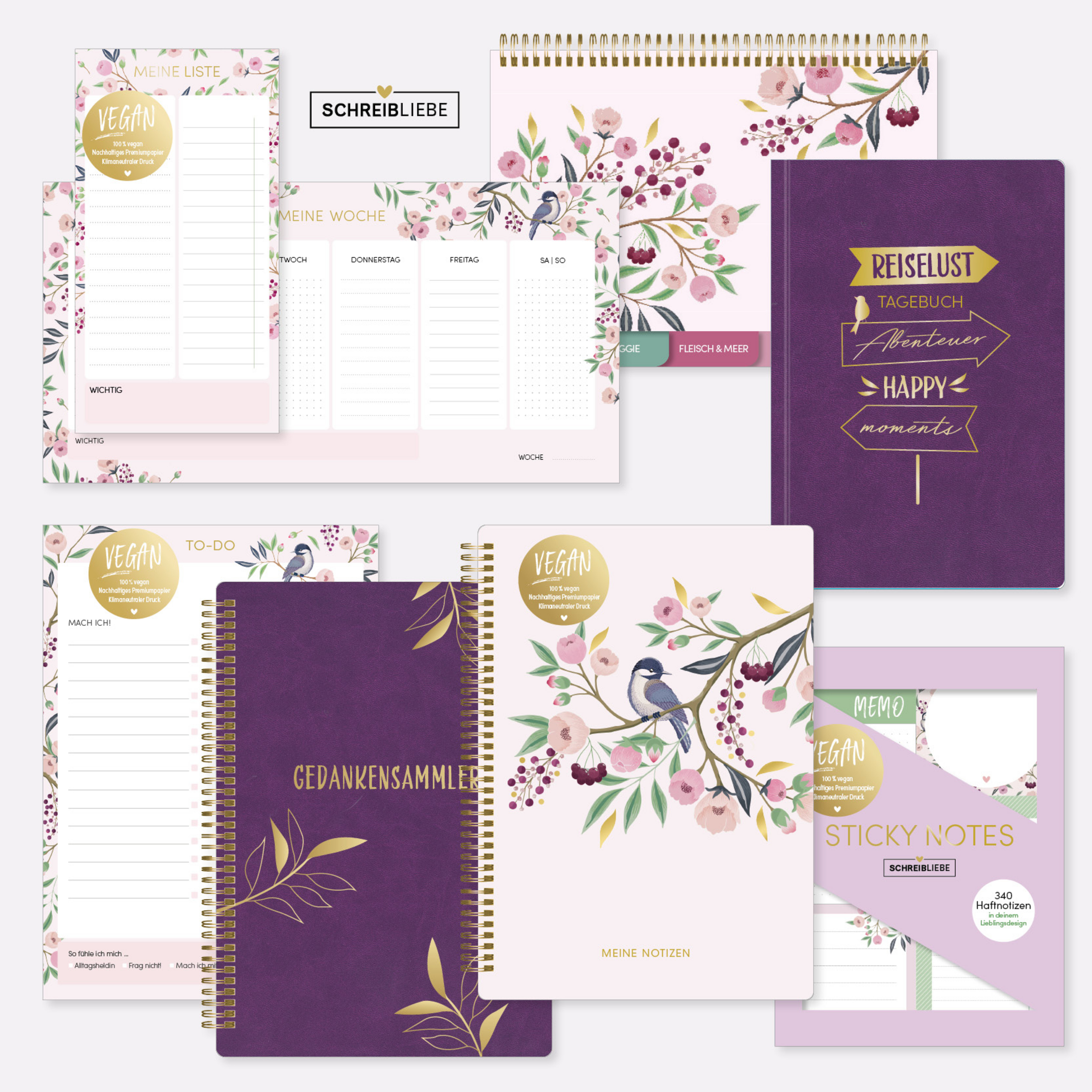 Plane deinen Tag mit Liebe! Entdecke weitere, inspirierende Lifestyle-Produkte in diesem Trend-Design: TO-DO-Liste, TO-DO-Block, Wochenplaner, Notizblock, Sticky Notes, Reisetagebuch und Rezeptbuch. Kollektion Lovely Flowers Die Kollektion Lovely Flowers setzt florale Akzente in sanften Lila- und Rosatönen. Zartes Design für Home-Office oder Büro. Wochenplaner im Format 29,7 x 15,5 cm 100 g umweltfreundliches FSC Papier 100 % vegan Klimaneutraler Druck Abreisßblock mit 50 Blatt Ohne festes Datum mit edlem Goldschnitt Mit diesem Wochenplaner bist du perfekt organisiert, egal ob auf dem Schreibtisch im Büro oder auf dem heimischen Küchentisch. Der SchreibLiebe-Wochenplaner ist eine wundervolle Geschenkidee für einen lieben Menschen oder für sich selbst.