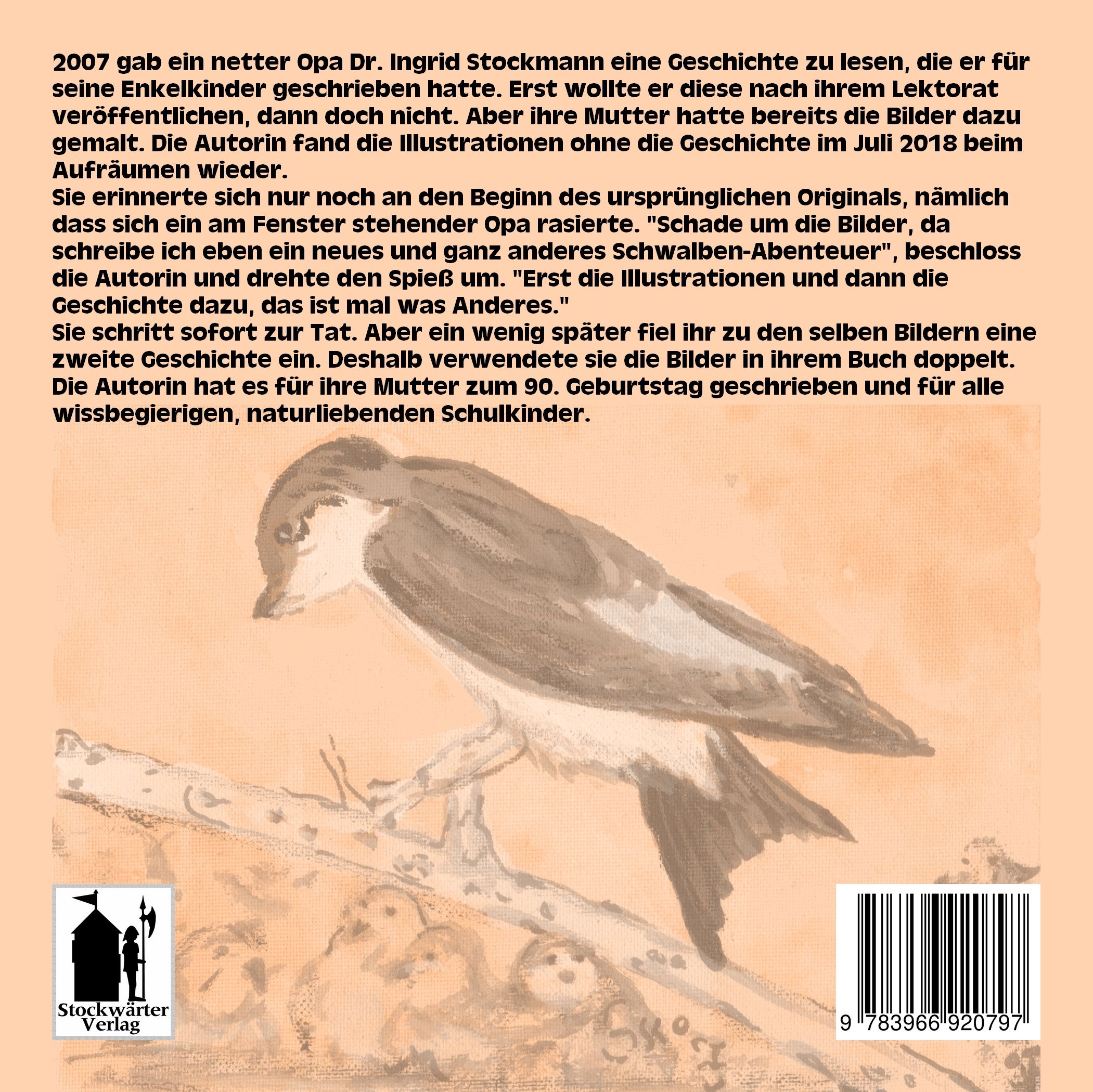 Sie erinnerte sich nur noch an den Beginn des ursprünglichen Originals, nämlich dass sich ein am Fenster stehender Opa rasierte. "Schade um die Bilder, da schreibe ich eben ein neues und ganz anderes Schwalben-Abenteuer", beschloss die Autorin und drehte den Spieß um. "Erst die Illustrationen und dann die Geschichte dazu, das ist mal was Anderes."