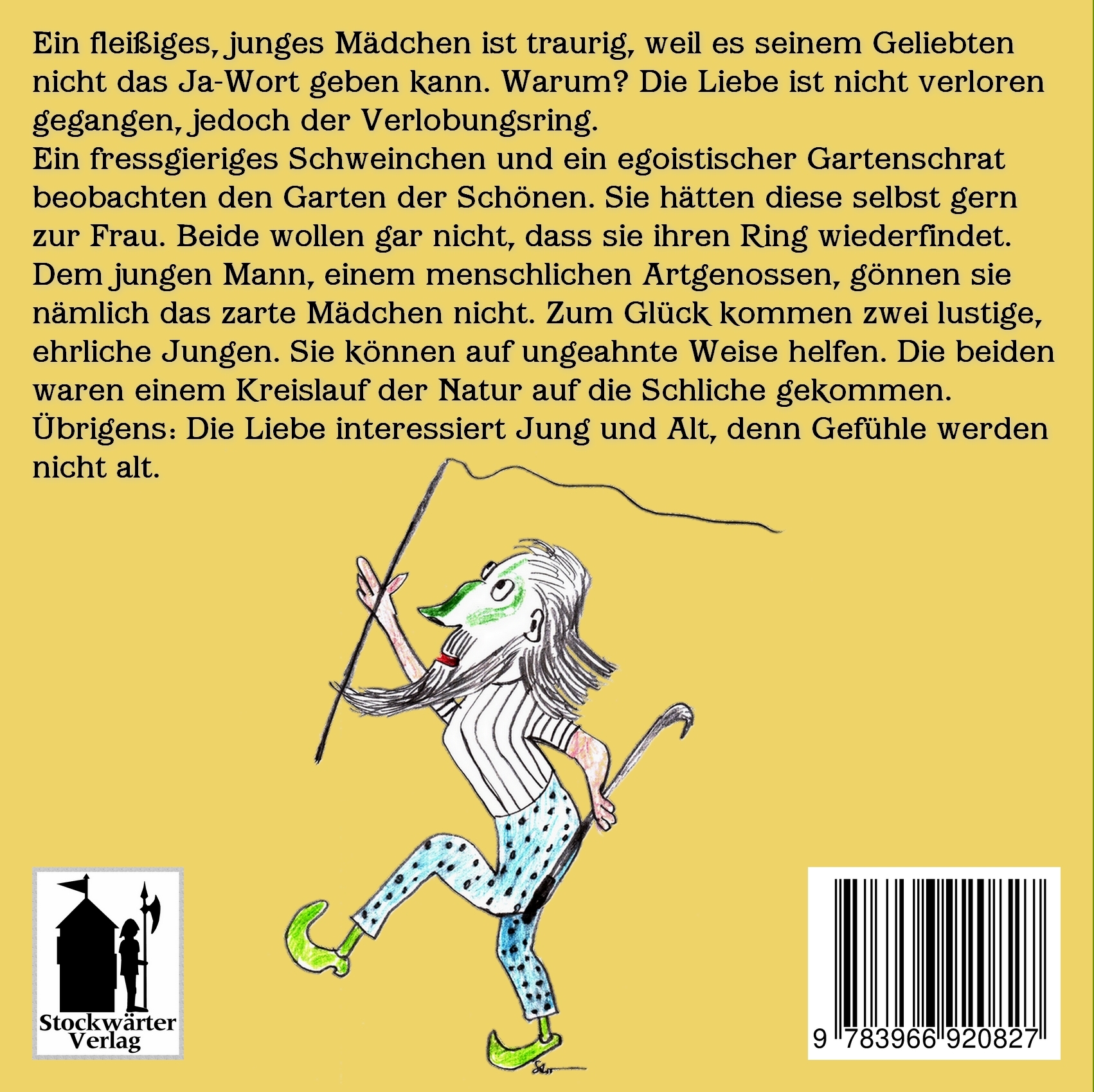 Ein fressgieriges Schweinchen und ein egoistischer Gartenschrat beobachten den Garten der Schönen. Sie hätten diese selbst gern zur Frau. Beide wollen gar nicht, dass sie ihren Ring wiederfindet.