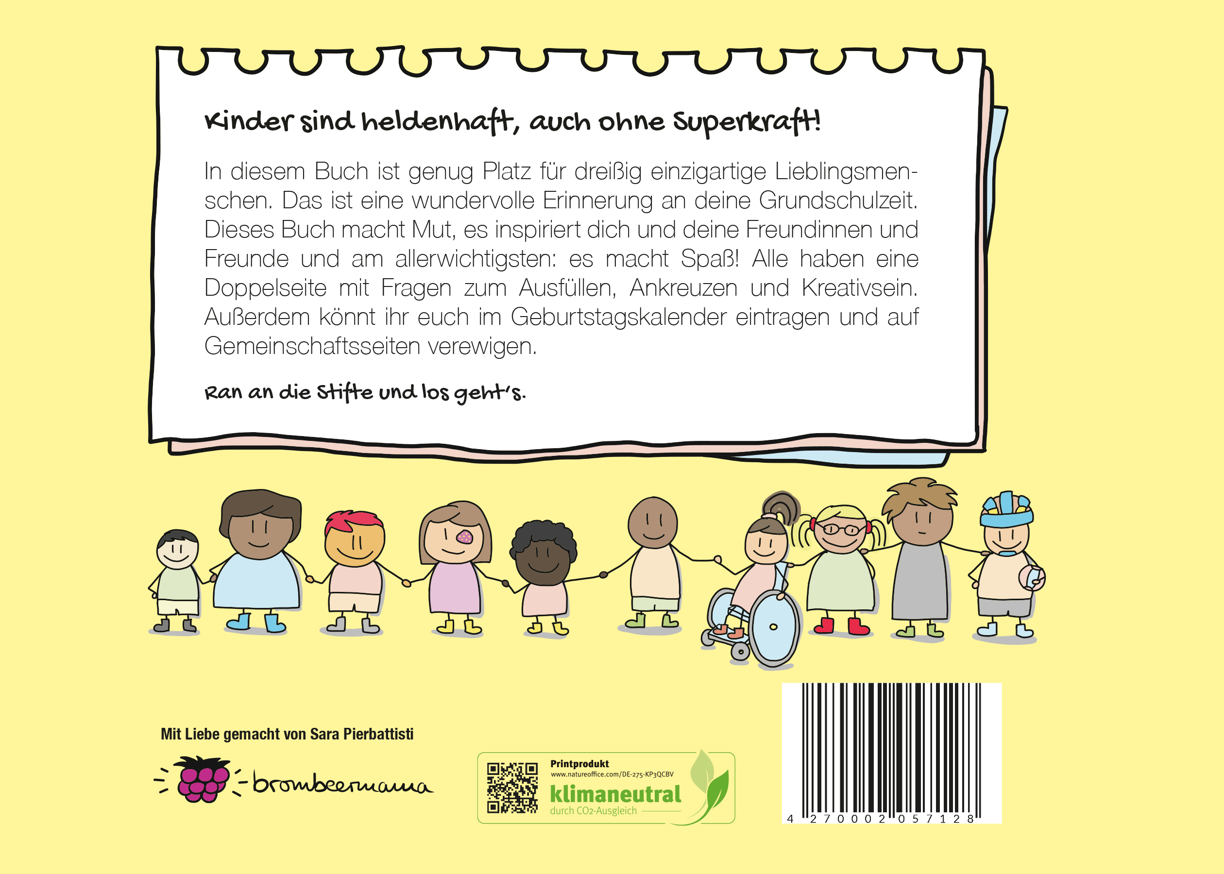 | Schlagworte | brombeermama • Diversität • Einschulung • Einschulung Geschenk • Eintragbuch • Freunde • Freundebuch • Freundebuch Grundschule • freundebuch grundschule jungs • freundebuch grundschule mädchen • Freundebuch Schule • freunde geschenkbuch • Freundinnen • Freundschaftsbuch • geschlechtsneutral • Grundschule • grundschule geschenkbuch • Grundschulfreunde • Inklusion • inklusives freundebuch • Kinder Geschenkbuch • Lieblingsmenschen • meine lieblingsmenschen • nachhaltig • Ökologisch • Poesiealbum • Schulfreunde • Schulfreundebuch • superhelden freundebuch • Unisex • Vegan • Vielfalt |