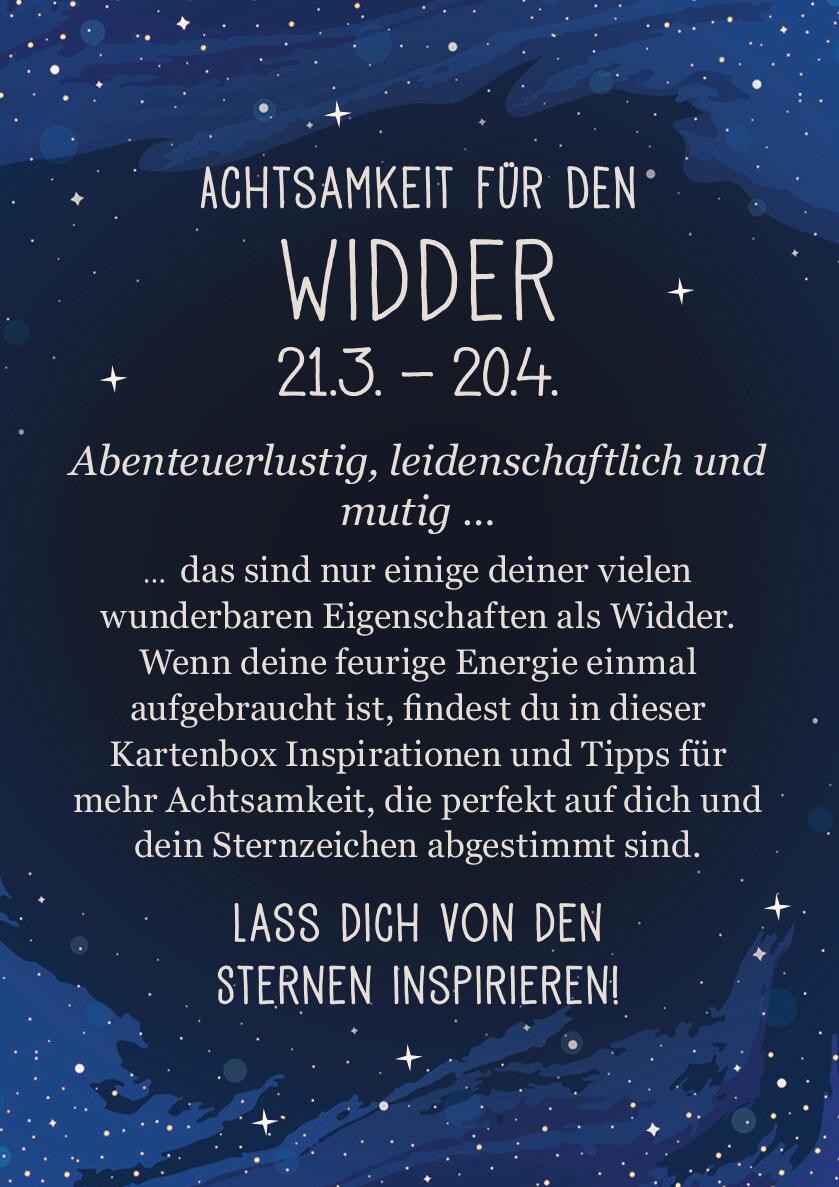 Die Sternzeichen-Kartenbox ist ein inspirierendes Geschenk für alle Widder - zum Geburtstag, als kleines Mitbringsel für jeden Anlass oder als Aufmerksamkeit für sich selbst. Für die beste Freundin, Kollegin, Mutter oder Schwester und alle, die mehr über den Einfluss des Sternenhimmels auf ihr Leben erfahren möchten.