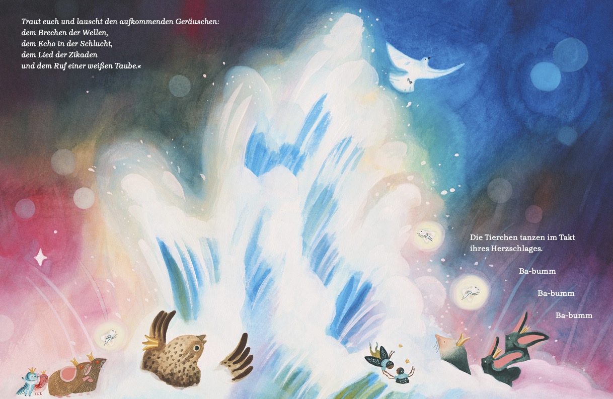 Wenn der Tag geht und die Nacht kommt, erwachen Käfer und Fledermäuse, Raupen und Nachtfalken. Gemeinsam machen sie sich auf den Weg und besuchen die Bibliothek der Dämmerung. Dort spinnt die Erzählerin der Nacht ihre Geschichten und weckt schönste Fantasien. Erst mit dem Morgengrauen kehren die Tiere wieder in ihre Verstecke zurück und spinnen die Erzählungen in ihren Träumen fort. Carmen Oliver und Miren Asiain Lora fangen die Magie des Vorlesens und die Schönheit der Nacht in all ihren Schattierungen ein. Mit diesem Buch feiern die beiden Künstlerinnen ihr Debüt bei NordSüd und ihre erste Zusammenarbeit über den Atlantik hinweg.