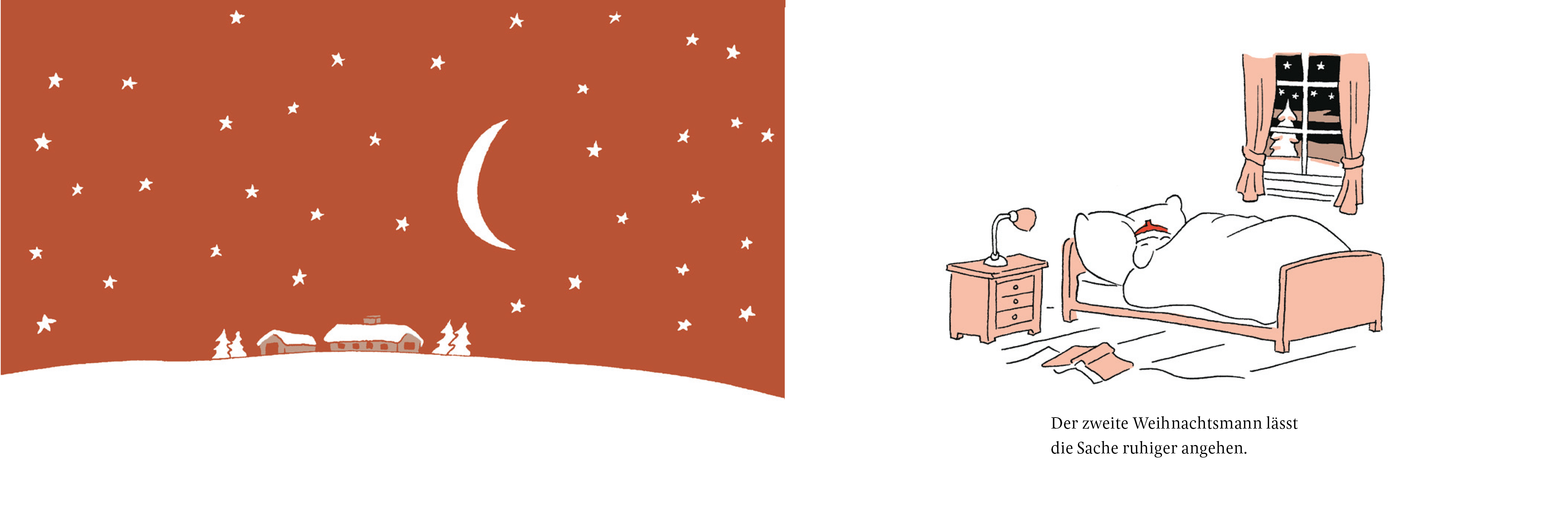 Die beiden Weihnachtsmänner sind eigentlich Freunde, aber ihre Berufsauffassungen könnten nicht unterschiedlicher sein. Der erste Weihnachtsmann fängt schon sehr früh mit seiner Arbeit an, belädt mühevoll seine Schlitten mit den vielen Geschenken, spannt die Rentiere an und hetzt von Termin zu Termin. Der zweite lässt es etwas ruhiger angehen: Warum nicht erst mal ausschlafen, ein Bad nehmen und danach eine Runde Schlittschuhlaufen? Als der erste Weihnachtsmann erschöpft von der letzten Runde nach Hause zurückkehrt und sich schwört, dass er sich diesen Stress zum letzten Mal angetan hat, erwartet ihn dort eine Überraschung ...