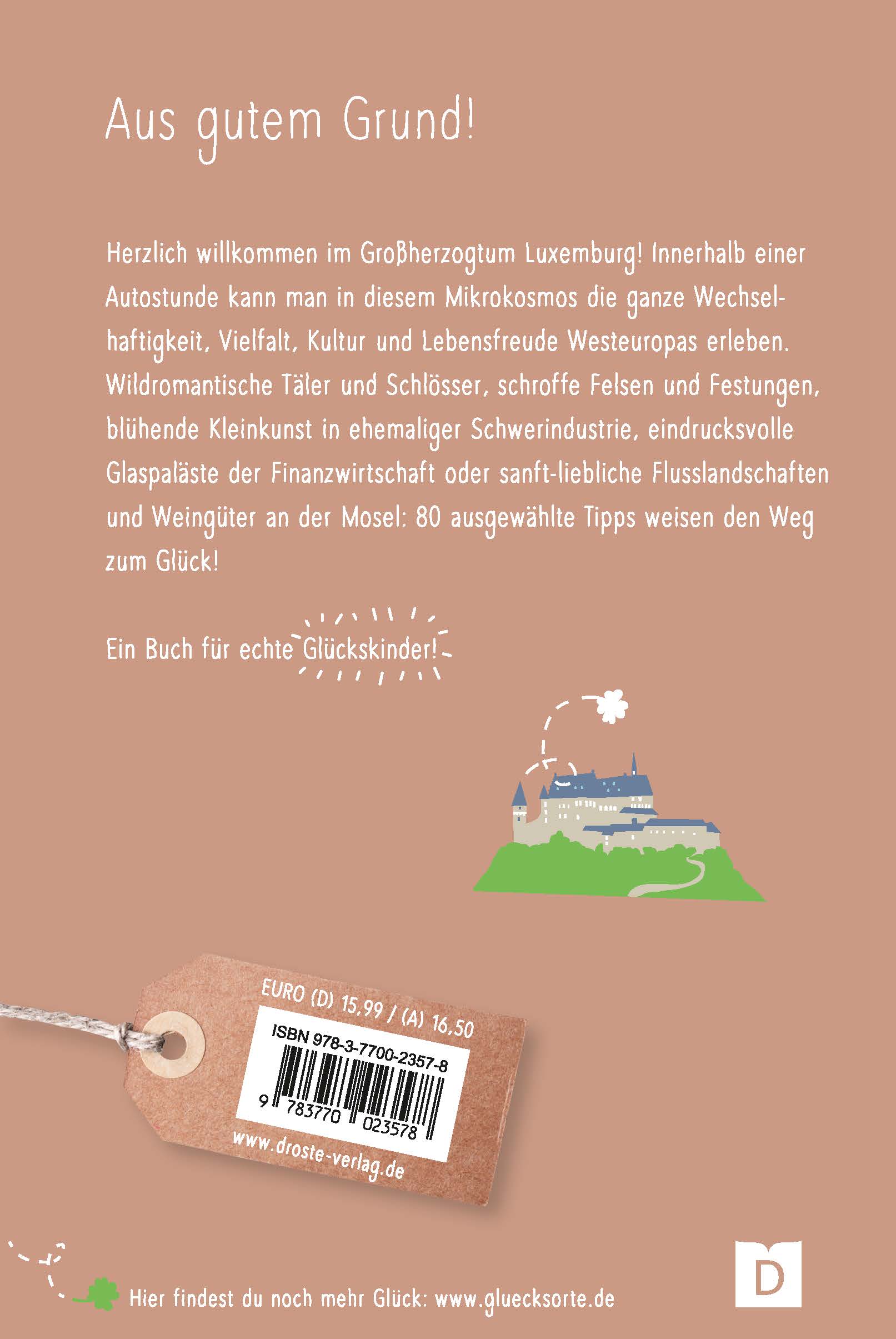 Herzlich Willkommen im Großherzogtum Luxemburg! Innerhalb einer Autostunde kann man in diesem Mikrokosmos die ganze Wechselhaftigkeit, Vielfalt, Kultur und Lebensfreude Westeuropas erleben. Wildromantische Täler und Schlösser, schroffe Felsen und Festungen, blühende Kleinkunst in ehemaliger Schwerindustrie, eindrucksvolle Glaspaläste der Finanzwirtschaft oder sanft-liebliche Flusslandschaften und Weingüter an der Mosel: 80 ausgewählte Tipps weisen den Weg zum Glück!