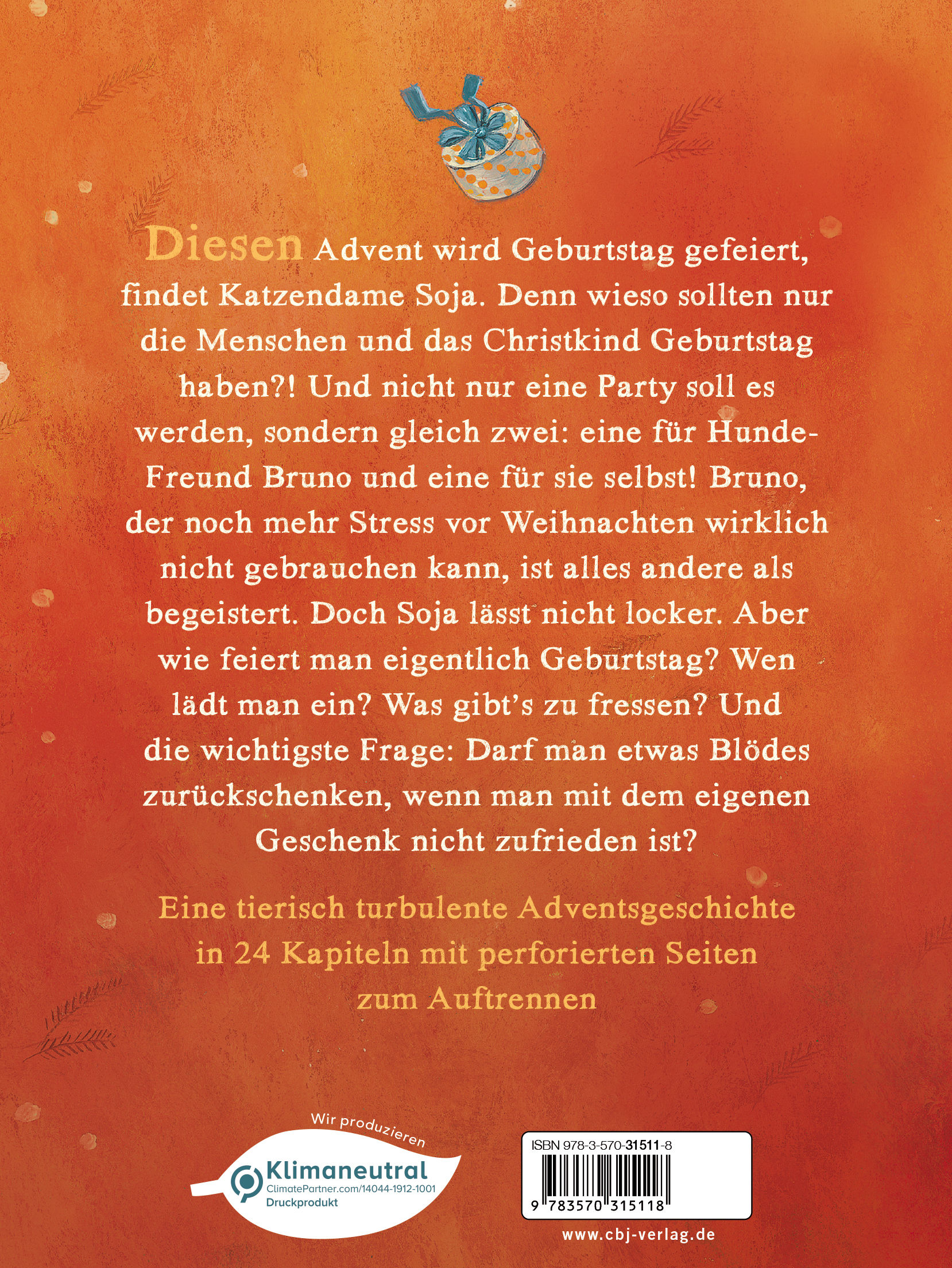 Diesen Advent wird Geburtstag gefeiert, findet Katzendame Soja. Denn wieso sollten nur die Menschen und das Christkind Geburtstag haben?! Und nicht nur eine Party soll es werden, sondern gleich zwei: eine für Hunde-Freund Bruno und eine für sie selbst! Bruno, der noch mehr Stress vor Weihnachten wirklich nicht gebrauchen kann, ist alles andere als begeistert. Doch Soja lässt nicht locker. Aber wie feiert man eigentlich Geburtstag? Wen lädt man ein? Was gibt's zu fressen? Und die wichtigste Frage: Darf man etwas Blödes zurückschenken, wenn man mit dem eigenen Geschenk nicht zufrieden ist? Bruno und Soja erwartet eine turbulente Adventszeit ... Eine tierisch gute Adventsgeschichte in 24 Kapiteln mit perforierten Seiten zum Auftrennen.Außerdem erschienen: